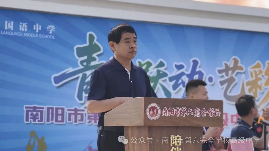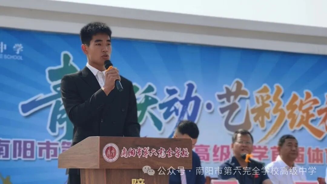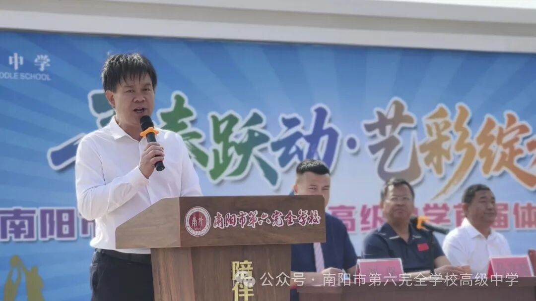 为深入贯彻党的教育方针,全面落实"五育并举"育人理念,构建多元校园文化生态,2025年5月23日上午,南阳市第六完全学校高级中学首届体育艺术节在热烈氛围中隆重举行。本次活动以"青春悦动 艺彩绽放"为主题,通过多元艺术形式与竞技赛事的深度融合,全面展现学校体教融合成果。宛城区政府二级调研员张明团,宛城区教体局党组书记、局长李烨,宛城区教体局党组成员肖幸昌,宛城区体育事业发展中心负责人张国晓,宛城区体育事业发展中心副主任康运锋,宛城区教体局体卫艺股负责人马立