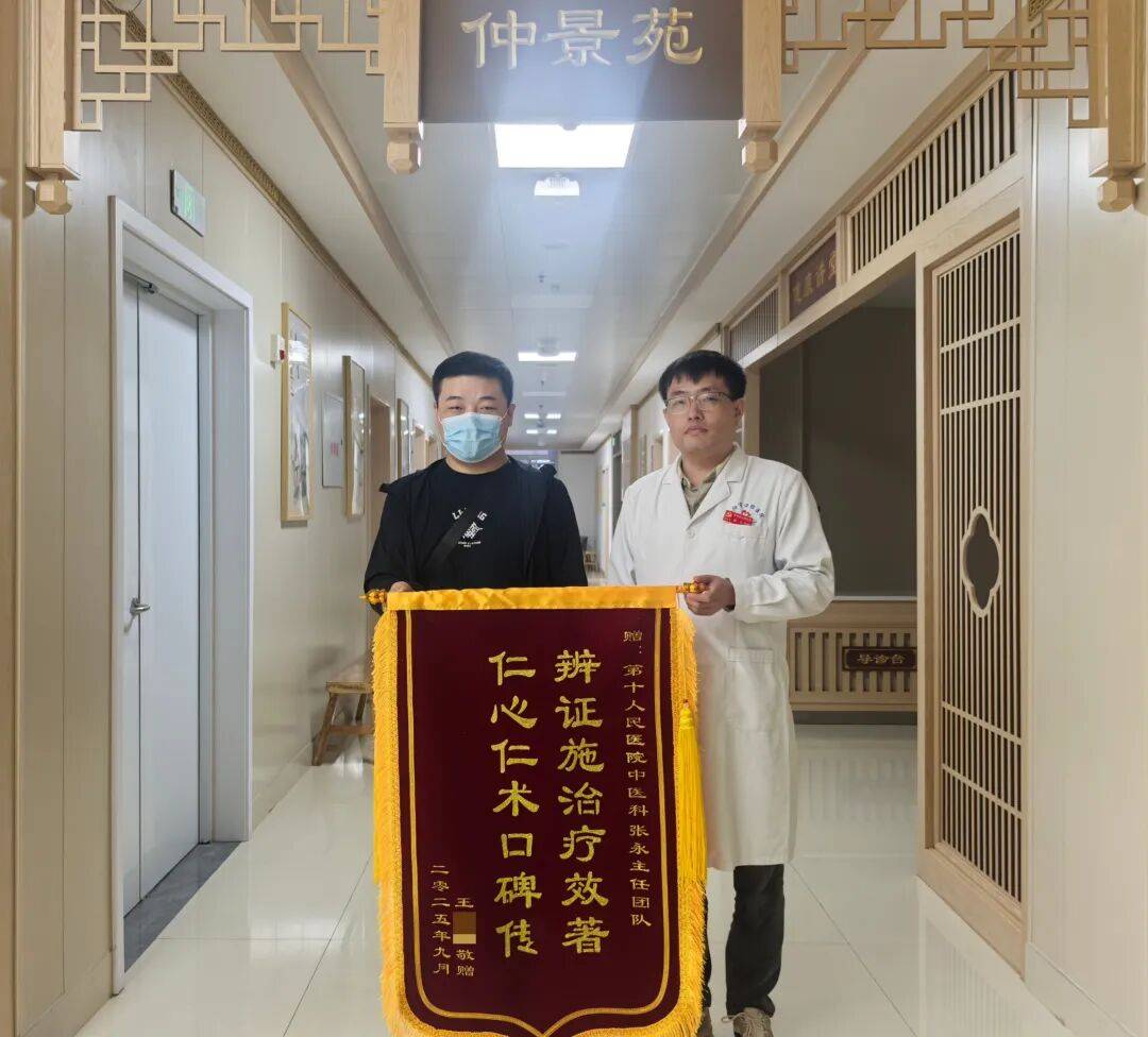 此前,家住卧龙区的王先生因长期胃部反酸、胃痛困扰,且进食辛辣寒凉食物后易出现腹痛、腹泻,辗转来到该院中医科就诊。张永主任团队结合患者症状辨证施治,为其制定个性化中汤剂调理方案。王先生按疗程连续服用三次(每次五天,共计十五天)中药后,胃部不适症状完全缓解,身心状态显著改善。为表达感激,9月29日,他特意送上一面印有“辨证施治疗效著 仁心仁术口碑传”的锦旗。