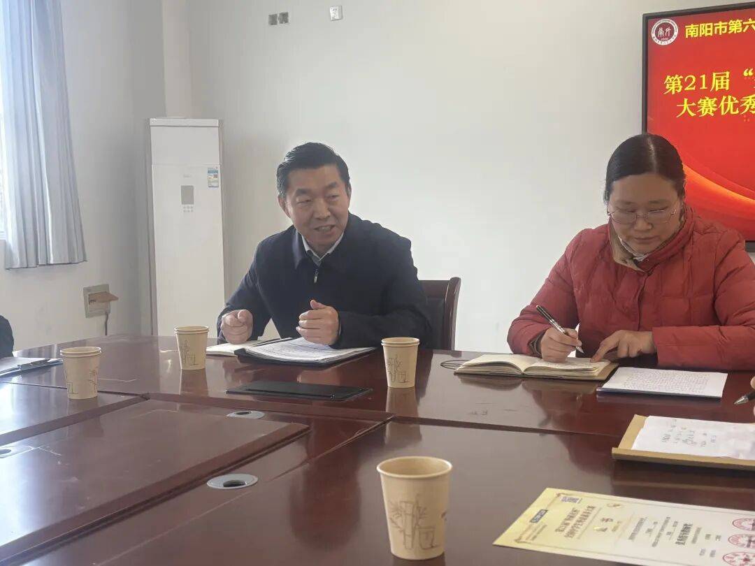 11月28日,第21届“外研社杯”全国中学生外语素养大赛优秀组织奖授牌仪式暨交流研讨会在南阳市第六完全学校高级中学圆满举行。民进河南省委会基础教育委员会常务副主任、外研社杯河南赛区负责人张合庆,南阳地区负责人徐源隆莅临六全高中,与我校副校长潘金旭及10名高中英语学科骨干教师代表齐聚一堂,共话赛事成果,共商新程安排。活动由英语组教研组长刘丽娟老师主持。