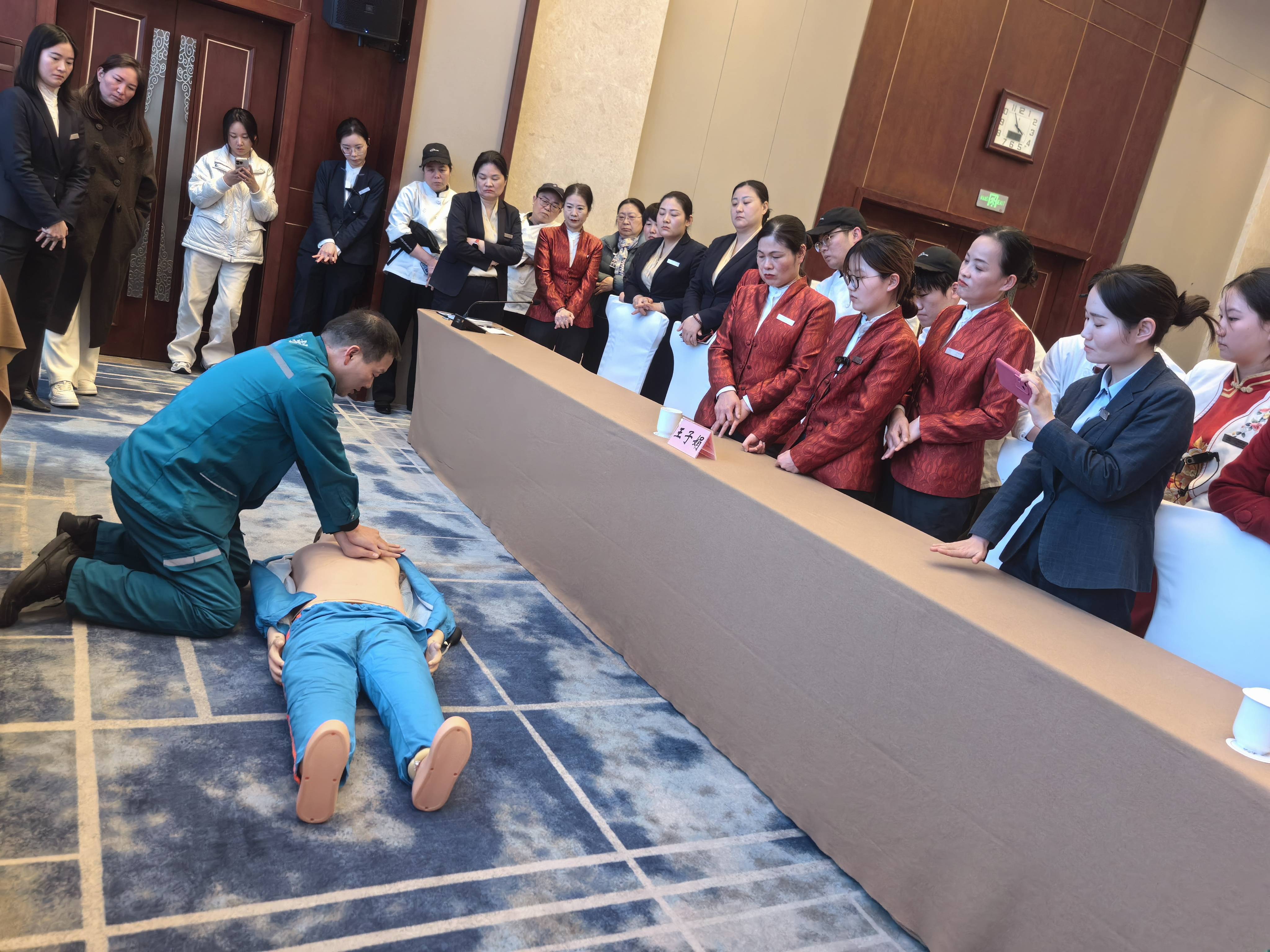 随后,急诊科主任许鹏聚焦心肺复苏急救技能开展实操培训。他现场演示胸外按压的深度、频率,人工呼吸的操作要领,以及急救黄金4分钟的关键原则,并结合日常工作生活中可能遇到的突发状况,讲解应急处置流程。参训员工近距离观摩学习,直观掌握了实用的急救技巧,提升了自救互救能力。