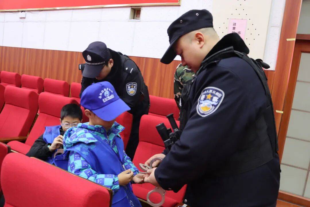 技能展示结束后,法警们现场演示了警棍、警用强光手电等警用装备的规范使用流程,结合真实工作场景,耐心讲解了各类警用装备的用途、适用情形及安全注意事项。在法警们的细心指导和保护下,小记者们踊跃参与体验,亲手触摸、佩戴警用装备,切实感受了警用装备的威慑力和司法警察工作的专业性。