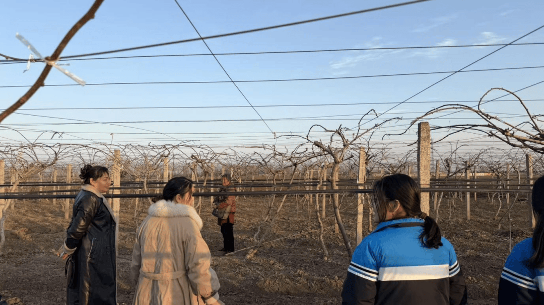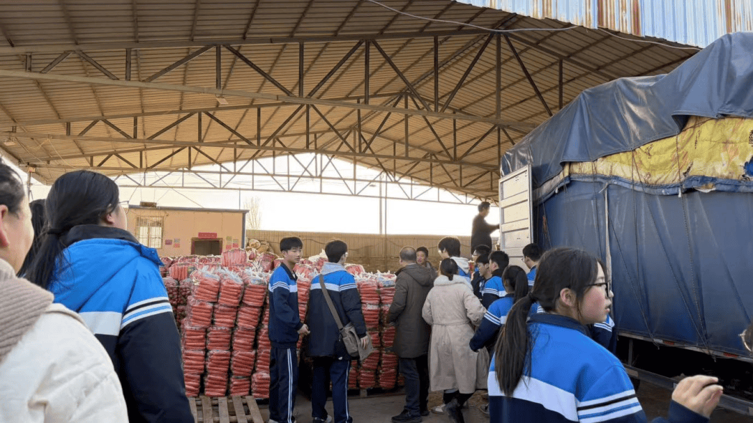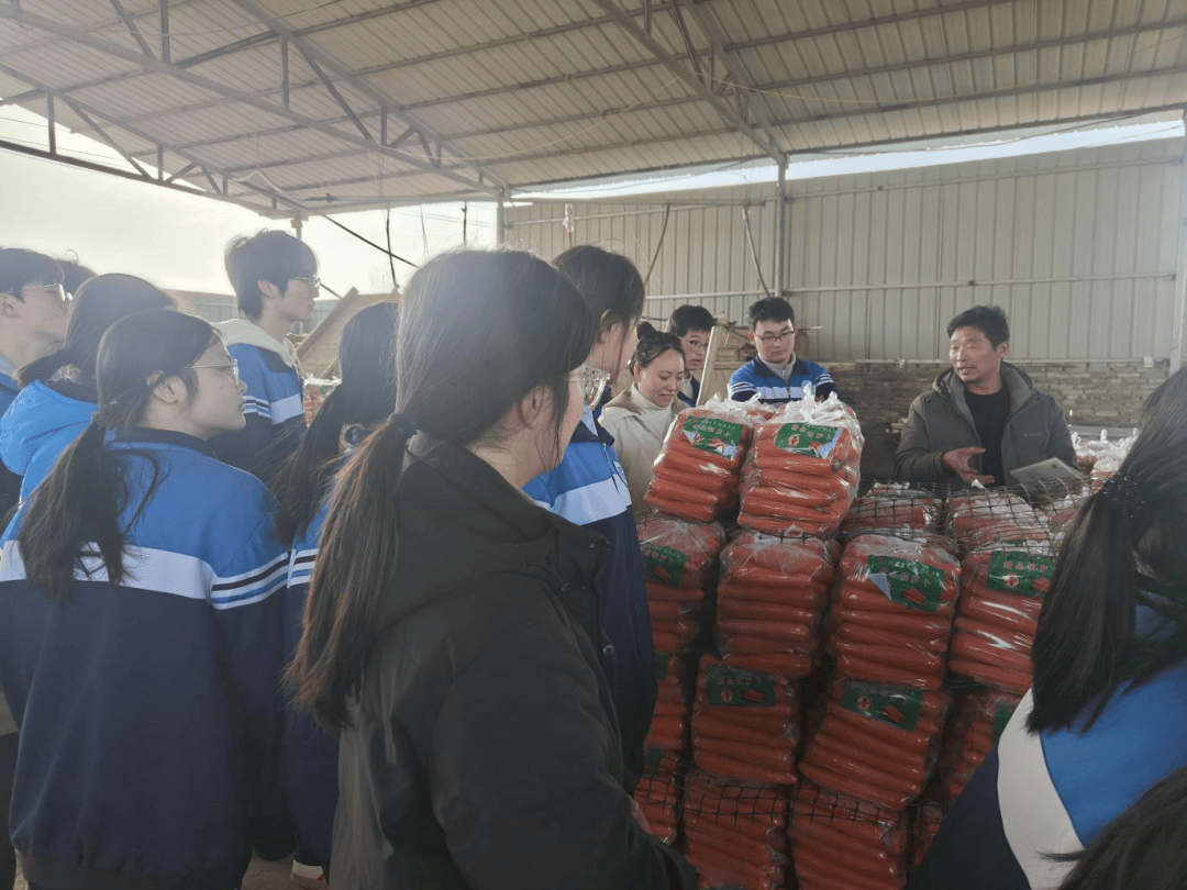 研学第二站,师生们在刘宋营村老教师的带领下漫步村落,聆听村庄百十年间的发展变迁。从昔日的革命根据地到如今的文明乡村,宽阔的道路、整洁的庭院、蓬勃的产业,让同学们直观感受红色基因传承下乡村振兴的丰硕成果。随后,队伍前往张典村,参观村委会之余,实地探访胡萝卜粗加工车间,见证农产品从田间地头到全国市场的流转历程;走进黄金梨与猕猴桃种植基地,地理教师们现场讲解特色农业种植的地理条件、管理技术与产业价值,让研学与学科知识紧密结合。
