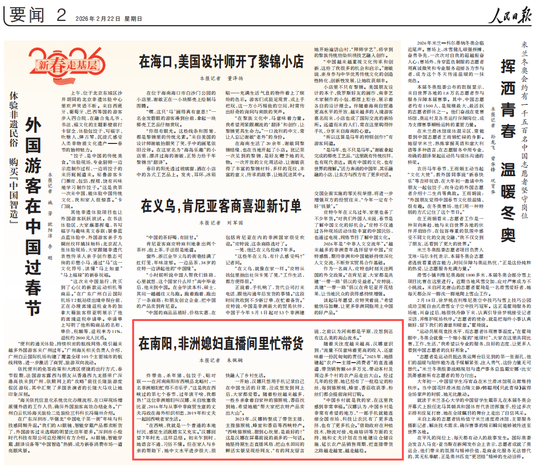 “中国乡村就是我的家,在这里我感到非常幸福。”汉娜认为,中国乡村是非常有希望的地方,“一部手机就能连接全国市场,科技让农民有了更多选择,也有了更多机会。”借助政府在种植技术、物流对接、电商培训等方面的支持,她和丈夫计划在当地建设仓储设施,延长农产品销售周期,把直播带货之路越走越宽、越走越稳。