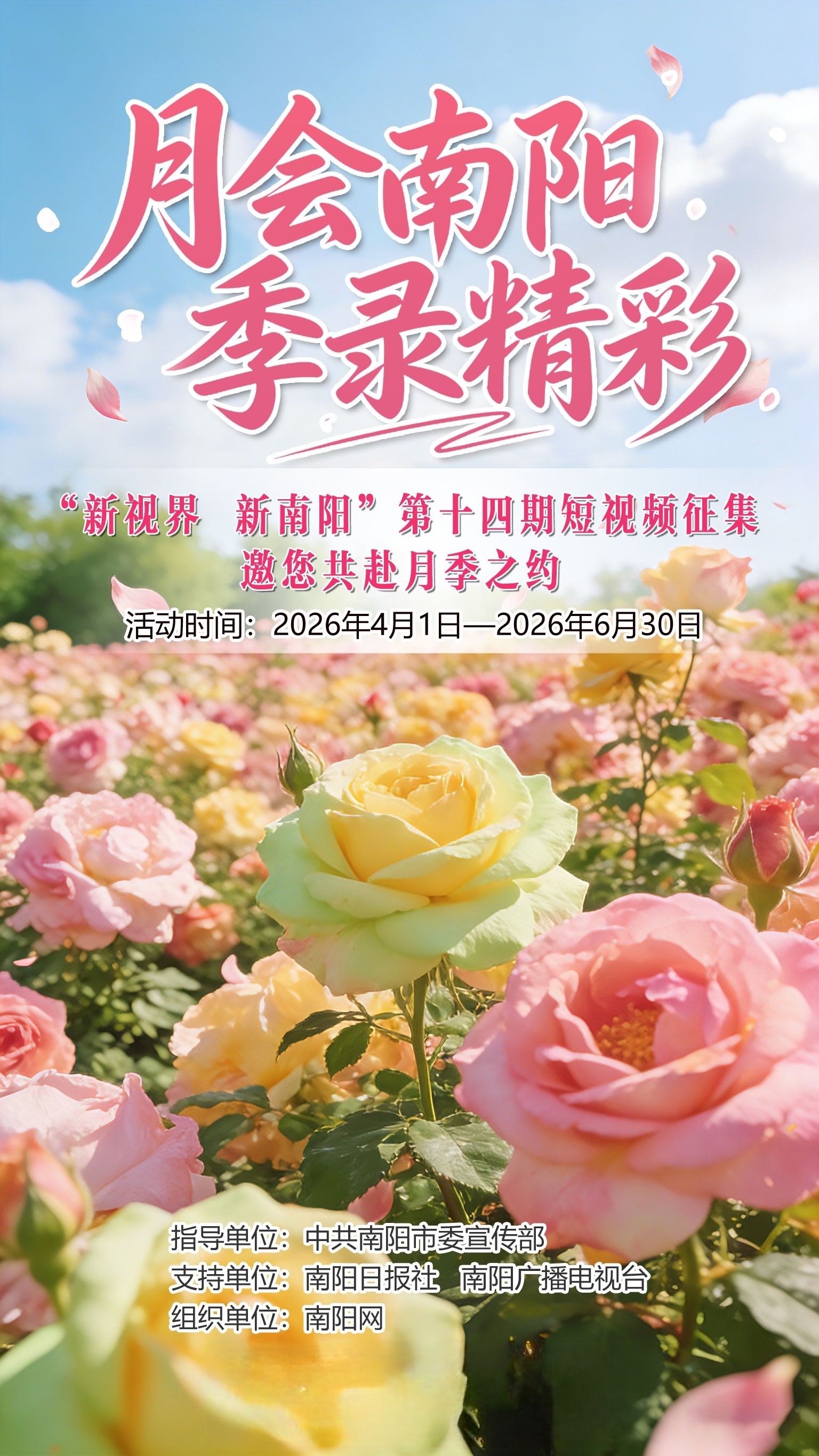 本期征集由南阳市委宣传部指导,南阳日报社、南阳广播电视台支持,南阳网具体组织,以月季为媒,设置四大创作方向:“月季之韵·城市之美”聚焦月季装扮的城市风貌、“月季之源·产业之兴”探访月季产业发展故事、“月季之恋·文化之魂”挖掘古老月季与历史文化渊源、“月季之趣·生活之味”记录市民游客赏花休闲的烟火气息。作品要求原创,时长15秒至1分半,发布时须在抖音、视频号等平台加挂“#新视界新南阳”“#月会南阳季录精彩”双话题,并发送至邮箱xsjxny@126.com(注明作者、联系方式及发布链接)。