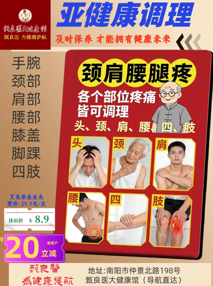 甄良医大健康馆立足南阳,以“为健康护航”为核心宣传定位,聚焦都市人群高发的颈、肩、腰、四肢等部位疼痛调理需求,将传统中医养生智慧与现代康养科技深度融合,打造集筋骨调理、艾灸养生、智能理疗为一体的综合性大健康馆,致力成为南阳市民的“社区健康管家”。