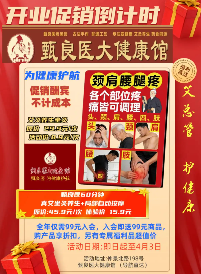 甄良医大健康馆开业活动将持续至4月3日,导航搜索甄良医大健康馆即可前往门店体验。无论是伏案工作的上班族、饱受筋骨困扰的中老年人,还是日常操劳的家庭人群,都可到店咨询体验,让甄良医的专业康养服务,为您驱散颈肩腰腿疼痛,重拾舒展自在的生活状态。