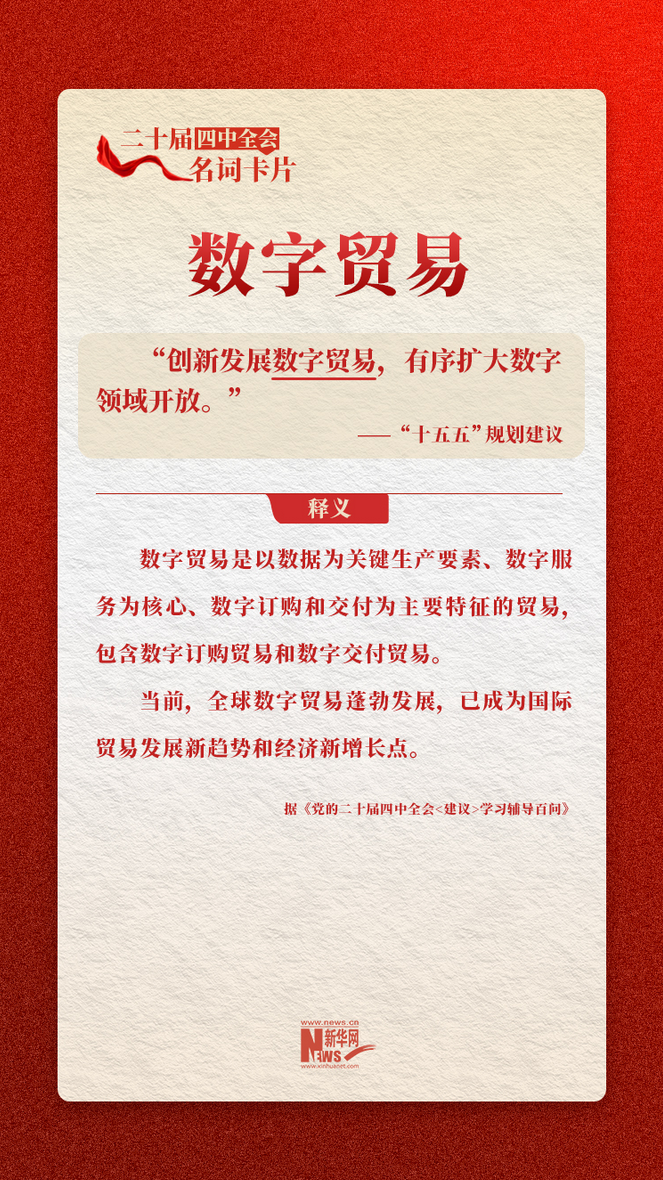 第四,深化数字贸易国际合作。积极参与各类多双边和区域数字贸易相关规则制定,营造开放、公平、公正、非歧视的数字发展环境。加快推进区域和双边贸易投资协定进程,积极推进加入《数字经济伙伴关系协定》。加强与东盟国家、中亚国家、金砖国家、上海合作组织成员国等数字贸易合作,扩大数字贸易“朋友圈”。(据《党的二十届四中全会<建议>学习辅导百问》)