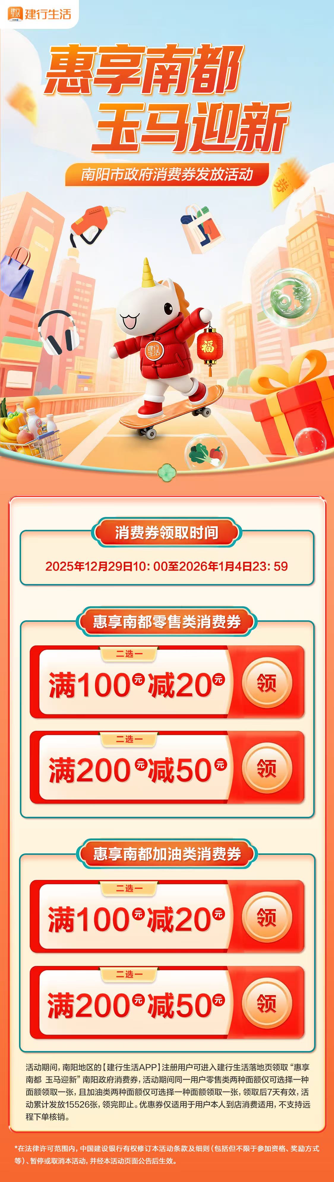 本次政府消费券将于2025年12月29日上午10时开始发放,在2026年1月4日23时59分结束;通过“建行生活”APP平台发放商超、百货、美食等零售类和加油类消费券共计15526张,消费者可在12月29日上午10时即领券期间,从“建行生活”APP首页“惠享南都 玉马迎新”南阳市政府消费券发放活动专区进入,零售类和加油类消费券均分为“满100元减20元、满200元减50元”二种,在指定时间领取消费券即可参与活动,活动期间每人每类限领取一张。领取之后,在“我的”—“优惠券”查看已领取的票券,并在七天有效期内至“建行生活”APP公布的参与活动线下实体商家消费。消费券仅适用于用户本人到店消费使用,不支持远程下单核券。优惠券数量有限,先到先得,领完为止!快下载建行生活准备开抢吧!