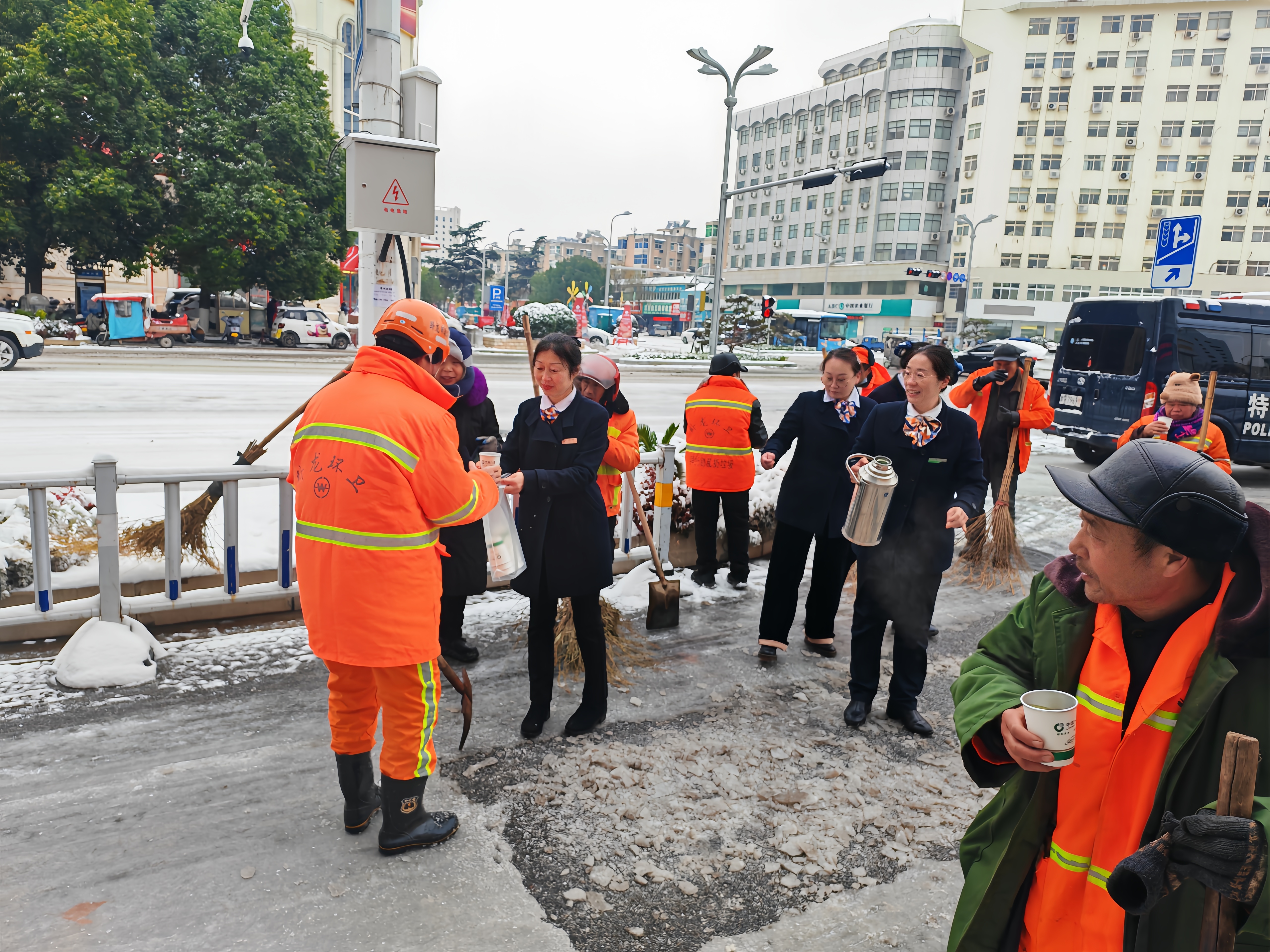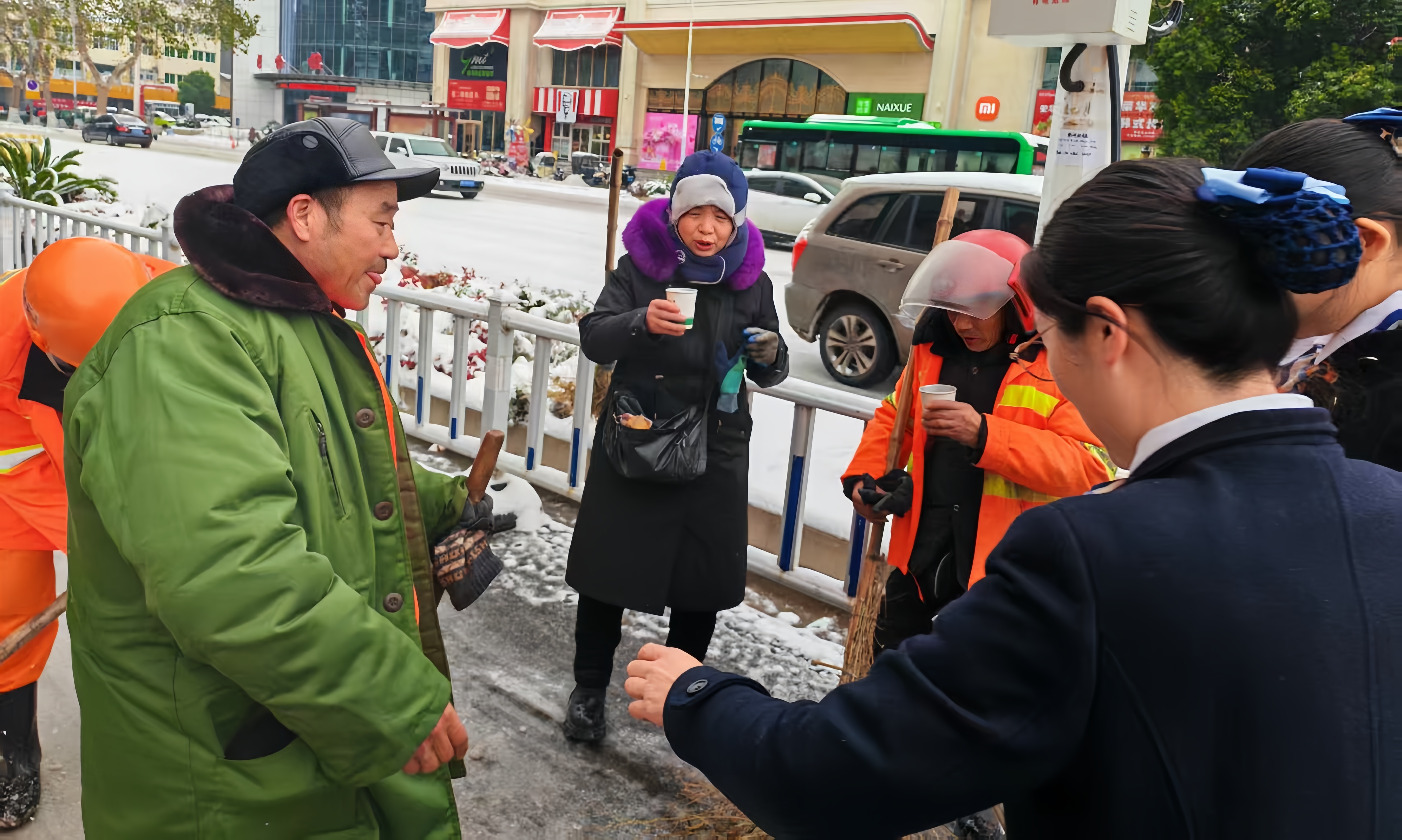 寒雪覆城,温情不减。1月20日,一场大雪为南阳披上银装,却给坚守一线的环卫工人带来严峻御寒考验。当日,中国人寿寿险南阳分公司工业路客户体验中心启动“暖冬关爱”公益行动,组织志愿者走上街头,为冒雪作业的“城市美容师”们送上热气腾腾的热茶,以实际行动传递金融企业的社会责任与民生温度。