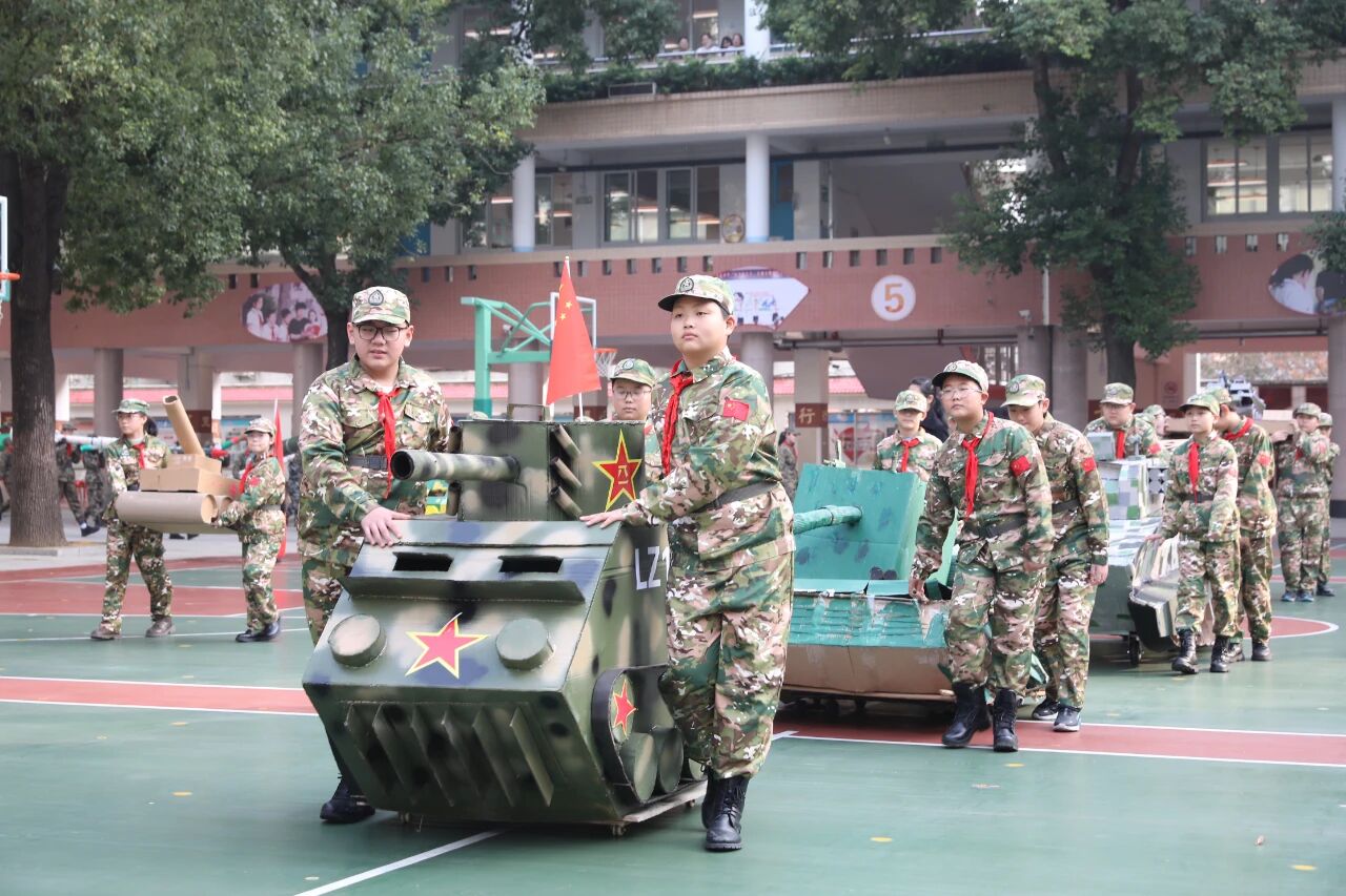 最引人注目的是武器模型方阵,学生们利用在项目化学习中掌握的知识,利用废旧纸箱等材料,精心制作出坦克、战机、航母、导弹等各类军事装备模型,每一件作品都造型逼真、细节满满,创意与匠心并存,将项目化学习成果转化为鲜活的国防教育素材,体现了探索精神与国防意识的深度融合。