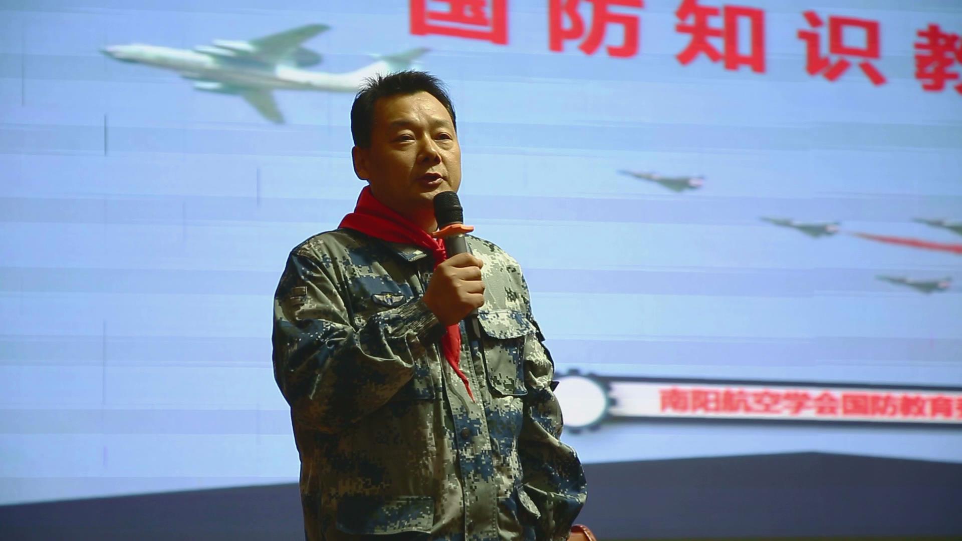 活动伊始,南阳市航空学会国防教育委员会主任刘新声的登场引发了全场欢呼。他结合自身数十年军旅生涯,以“蓝天守护者”的视角,为同学们展开了一幅波澜壮阔的空军发展画卷。从早期空军装备的艰难起步,到如今先进战机翱翔苍穹的辉煌成就,从实战任务中的惊险瞬间,到飞行员日常训练的严苛要求,他用生动的讲述、珍贵的亲历故事,将抽象的空军发展史转化为鲜活的课堂内容,将蓝天卫士的忠诚与担当深深植根于学生心中。