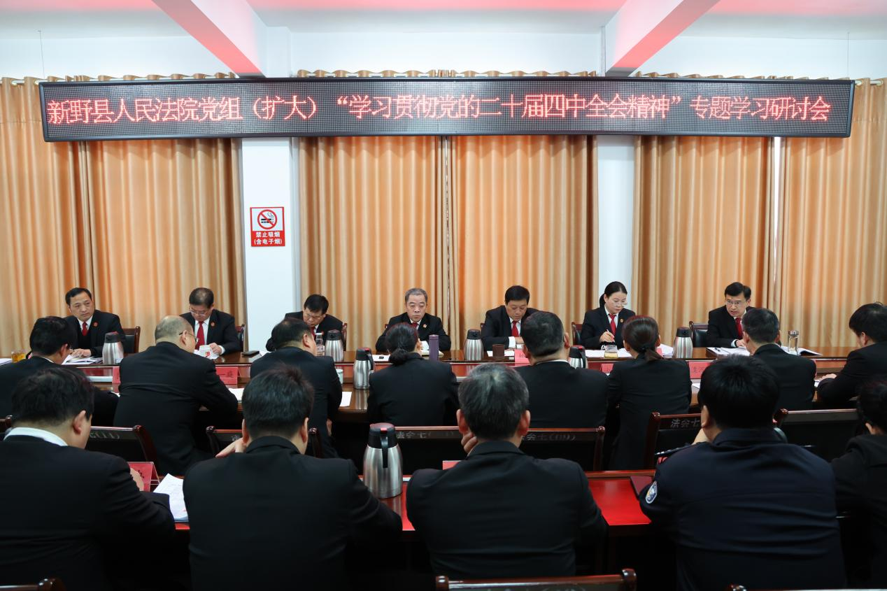 11月14日,河南省新野县人民法院召开党组(扩大)会议,专题学习贯彻党的二十届四中全会精神,深入领会全会核心要义,研究部署落实举措。院班子成员、各部门负责人及员额法官参加会议。