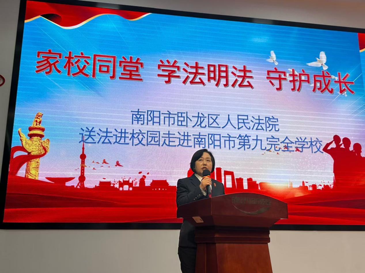在“全国交通安全日”即将到来之际,清脆的法槌在校园内响起,一场沉浸式法治教育课正式拉开帷幕。11月25日,南阳市第九完全学校的报告厅变身成为一座真实的法庭,卧龙区法院在该校公开审理一起涉未成年人非机动车交通事故责任纠纷案件,为师生们敲响了交通安全的“平安警钟”。此次庭审邀请省、市级多家新闻媒体参与,南阳中院微直播团队全程参与,该校1700余名师生及家长代表旁听庭审。
