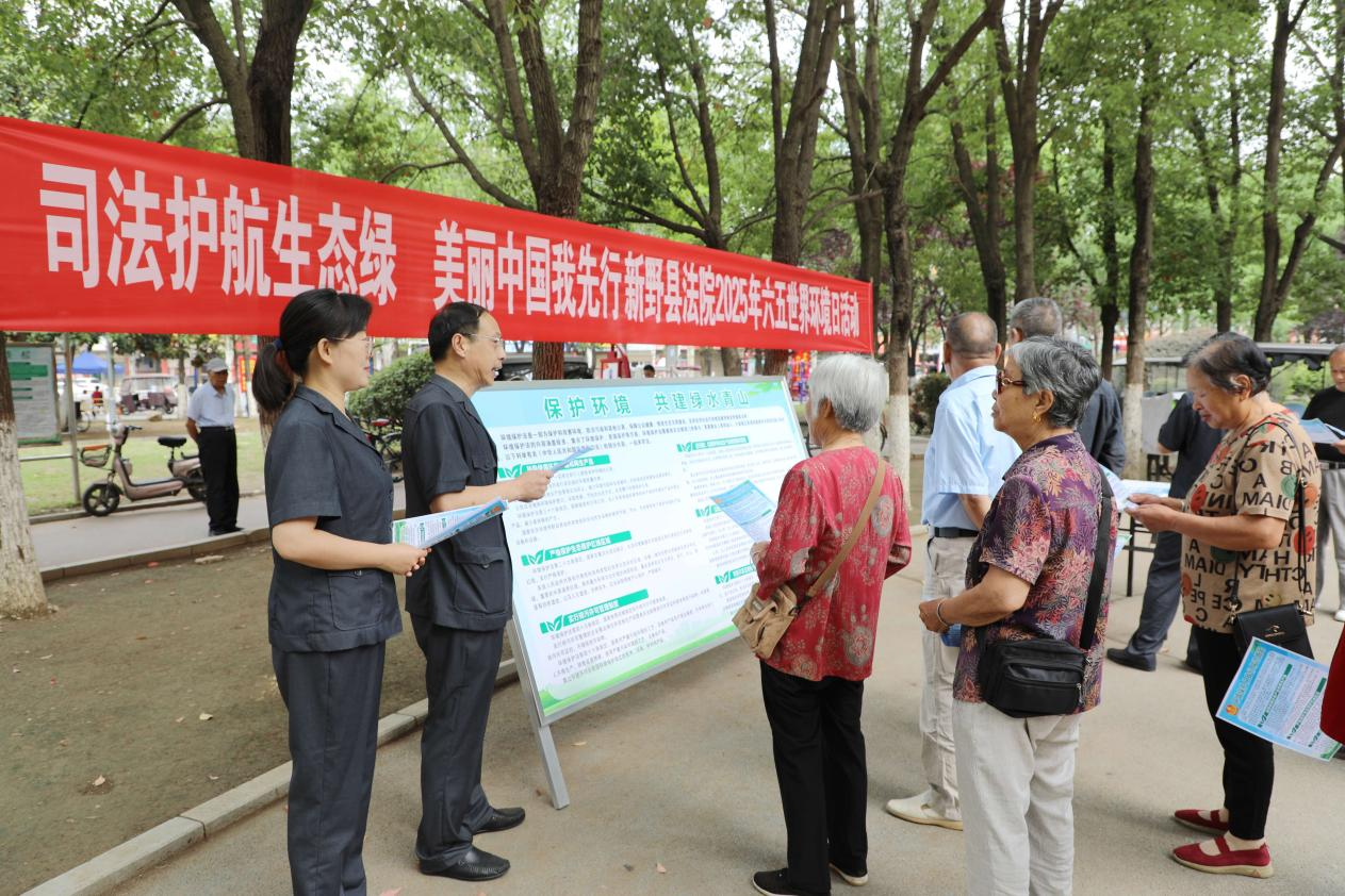 2025年6月4日,在世界环境日到来之际,新野县人民法院深入社区广场开展世界环境日主题宣传活动,通过悬挂环保宣传标语、摆放主题展板、设立法治咨询台、发放宣传册、现场讲解等方式,向群众普及宣传世界环境日的由来、重要意义以及日常生活中保护环境的建议,将法治力量融入生态文明建设,推动形成“人人参与、人人守护”的绿色发展新风尚。干警们结合审判工作实际现场解答群众关于垃圾分类、噪声污染等问题的咨询,号召大家从自身做起、从现在做起、从身边小事做起,树立环保意识,践行绿色生活方式,自觉抵制破坏生态环境的行为,为建设人与自然和谐共生的现代化贡献自己的一份力量。近年来,新野县法院持续立足审判职能、延伸司法服务触角,创新普法宣传形式,以司法之力守护绿水青山,践行“两山”理念、服务生态文明建设。