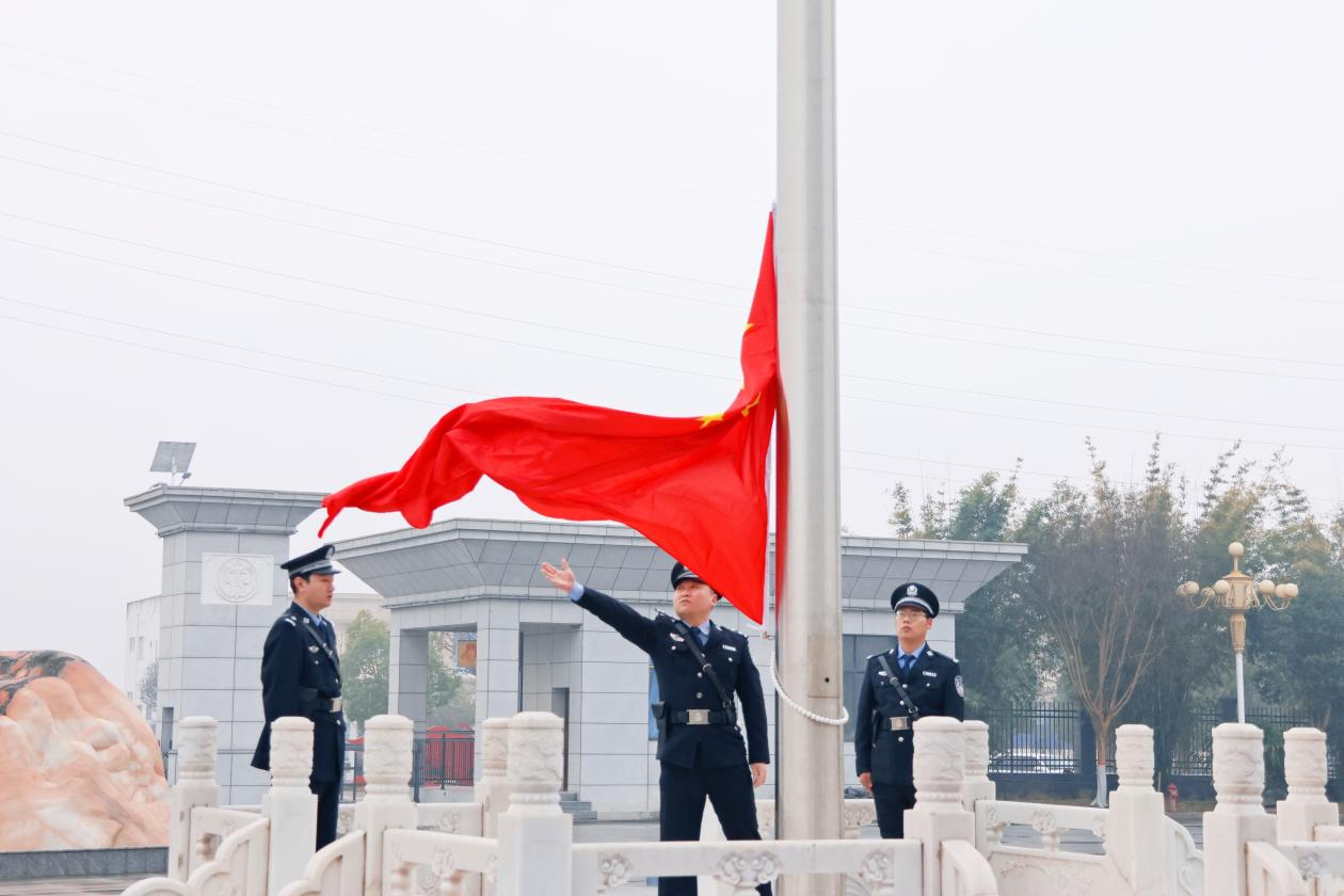 上午8点30分,升旗仪式准时开始。护旗手队迈着铿锵有力、整齐划一的步伐,护送五星红旗走向升旗台。伴随着雄壮的《义勇军进行曲》,五星红旗缓缓升起、迎风招展。全体干警肃立注目,向国旗致以崇高敬意,心中激荡着对党和国家的忠诚,以及守护公平正义的责任担当。