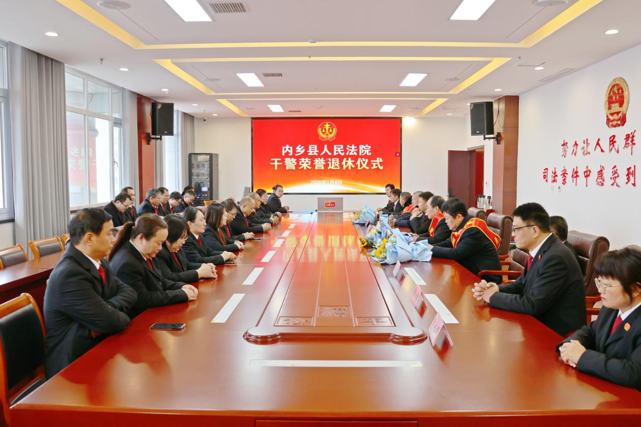 当日上午,荣退仪式在肃穆的氛围中正式启动。内乡县人民法院领导班子全体成员、各部门负责人及干警代表悉数到场,共同见证这一温情满满的时刻。仪式现场,院领导逐一为退休老干部献上象征敬意与祝福的鲜花,郑重递上定制的退休纪念牌 —— 牌面之上,“光荣退休”四个醒目字样,既是对老干部数十年职业生涯的圆满定格,更是全院上下对他们辛勤付出的高度认可与由衷感念。