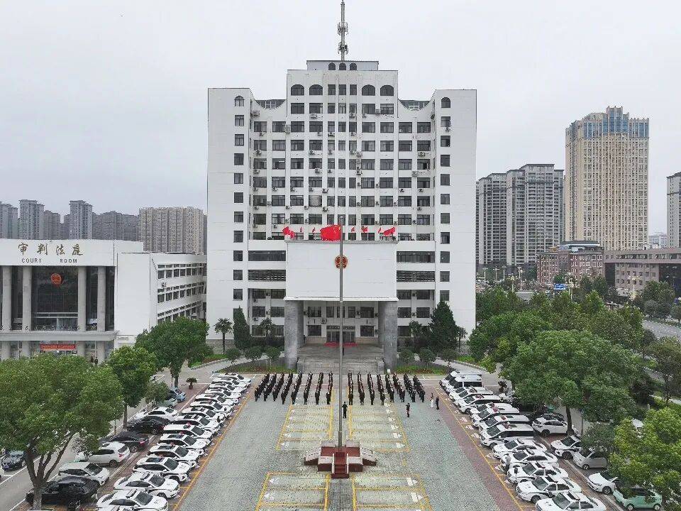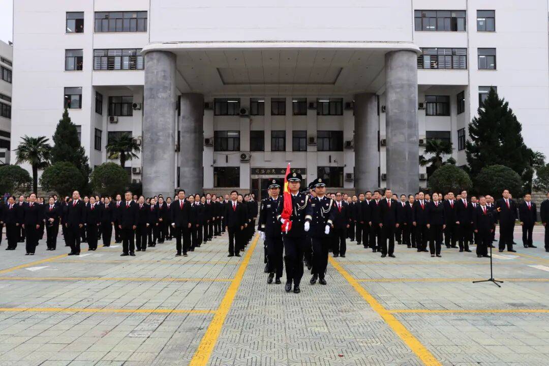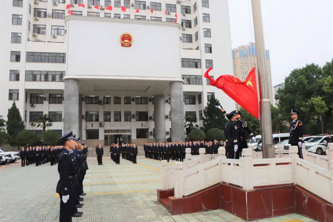 上午9时,干警们身着制服、精神饱满、整装肃立。由法警组成的国旗护卫队迈着铿锵有力的步伐,护送五星红旗走向升旗台。在嘹亮的国歌声中,鲜艳的五星红旗冉冉升起,迎风飘扬。全体干警怀着崇敬之情迎着国旗行注目礼,表达对祖国和人民的忠诚和热爱,展现了锐意进取、奋发有为的精神风貌。