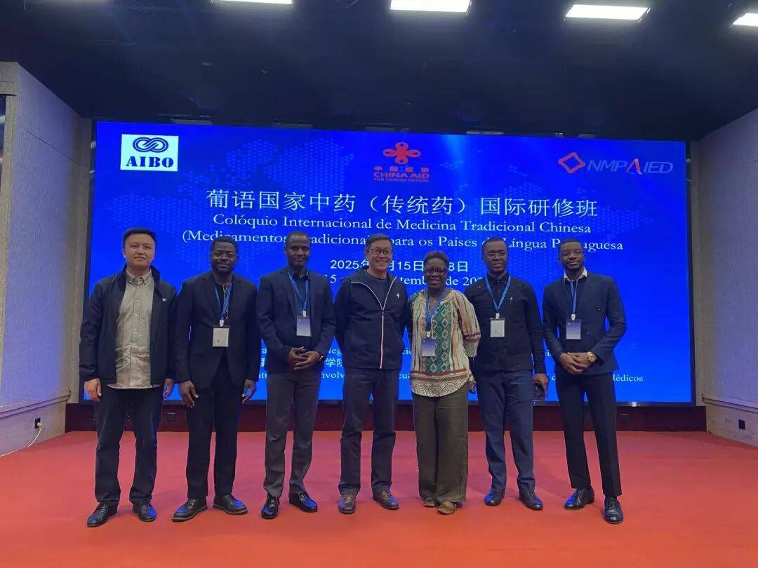 西施兰药业董事长郑鸿及生产部经理邢广增与葡语系国家参与研修班人员合影