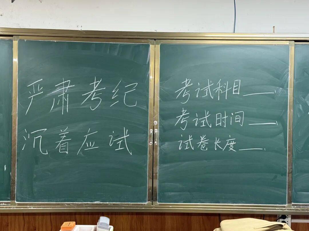 为杜绝外界干扰,所有监考教师考前统一上交手机,考场内配备屏蔽仪,确保信号全屏蔽,同步安排金属探测安检,确保考试公平!所有考场均按照标准化要求进行布置,桌椅整齐,间距合理,卫生整洁。黑板上书写着醒目的考试科目、时间及“严肃考纪,诚信应考”的标语,营造出既庄重又温暖的考试氛围。