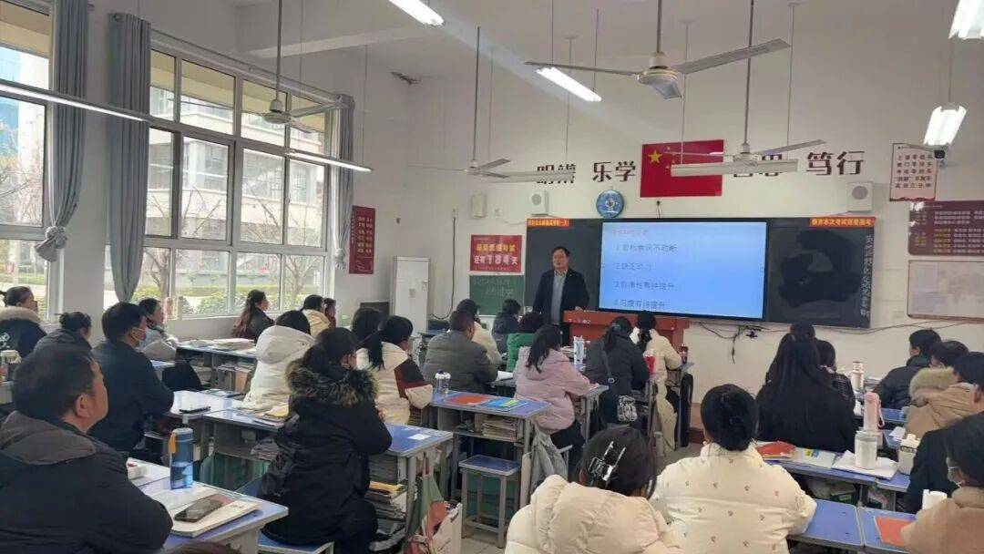 随后,高三年级校长刘坚结合当前高考形势,进行了深度解读与备考部署。刘校长指出,2026 年高考是河南省新高考 “3+1+2” 模式落地的关键一年,竞争形势严峻。明确了学校的三级升学目标,并介绍了领导分包班级、分层教学、个性化辅导等备考举措。