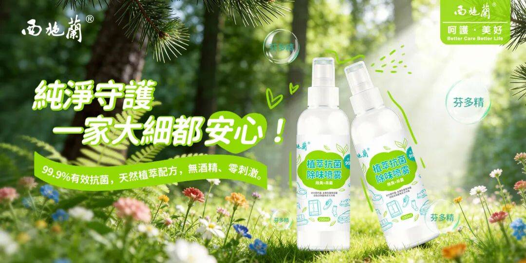 西施兰植萃抗菌除味喷雾,不依赖浓烈香精去遮盖,而是依托芬多精、丝兰提取液、银杏提取液、绿茶提取液等多种天然植萃精华,主动分解引发异味的细菌与分子。无酒精配方,温和不易刺激,杀菌率高达99.9%,即使家中有婴幼儿或宠物,亦可安心使用。