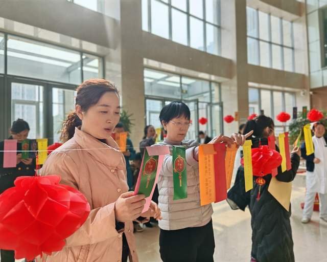 门诊大厅内张灯结彩、喜气洋洋,五彩斑斓的灯谜高高挂起,火红的灯笼点缀其间,灯谜内容兼顾知识性与趣味性,既有自然哲理、生活常识,也融入有健康科普小知识,吸引了不少职工与患者驻足参与。大家或低头沉思,或轻声交流,不时传来欣喜笑声,现场洋溢着浓浓的节日温情与人文暖意。