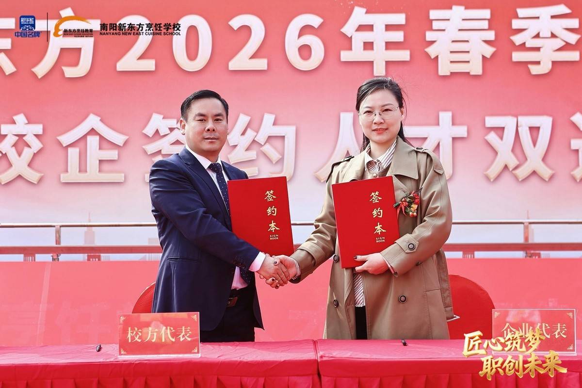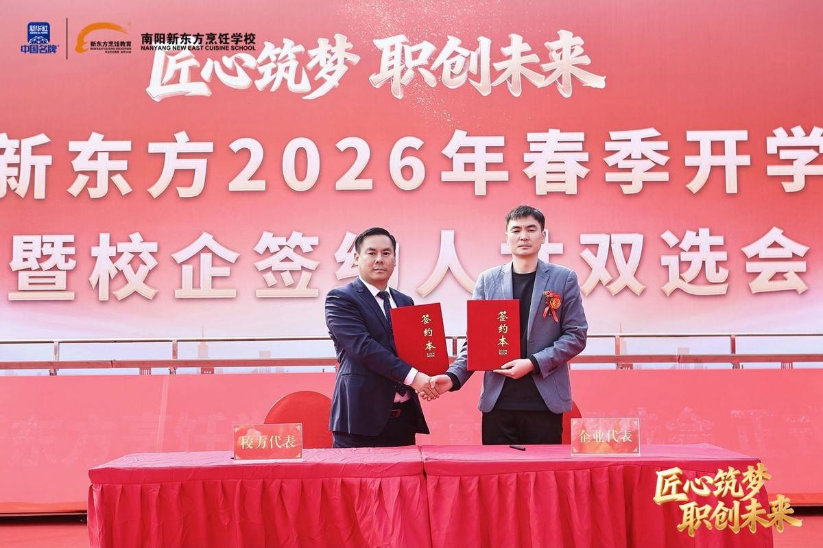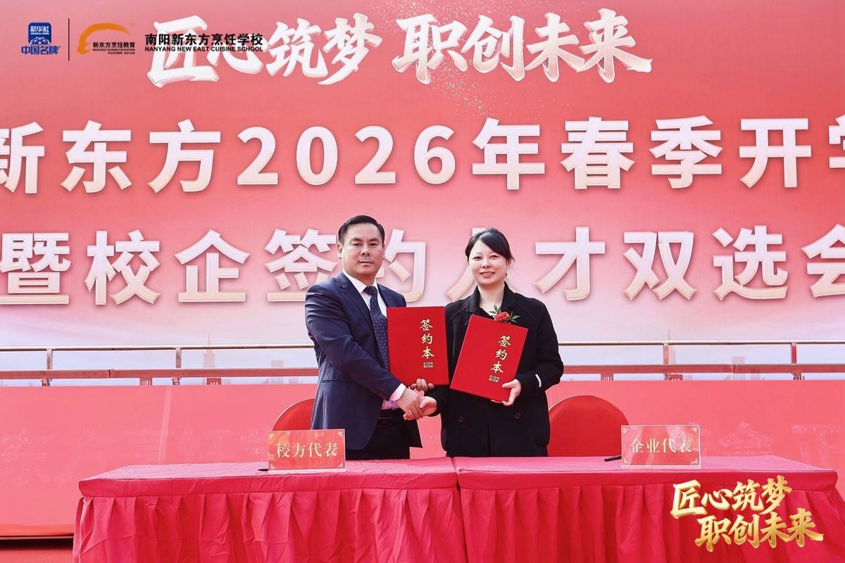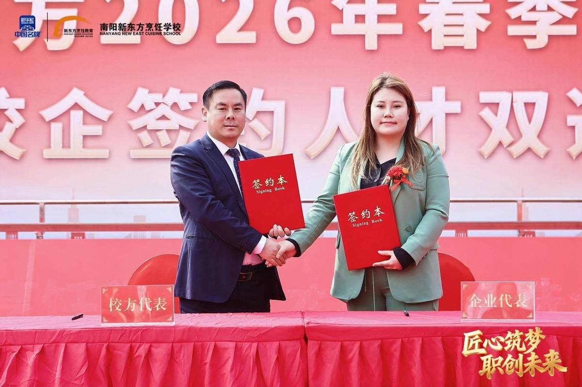 职业教育因产教融合而兴,因校企协同而强。我国产教融合政策历经近40年探索与深化,企业已成为职业教育育人的重要主体。2026年,全国餐饮、酒店、食品等多领域名企纷纷向南阳新东方烹饪学校抛出橄榄枝。仪式上,各深度合作企业代表依次上台签约,校企双方正式建立长期稳定的战略合作关系,将在人才定制培养、实习就业安置、课程联合研发、实训基地共建等方面开展全方位合作。