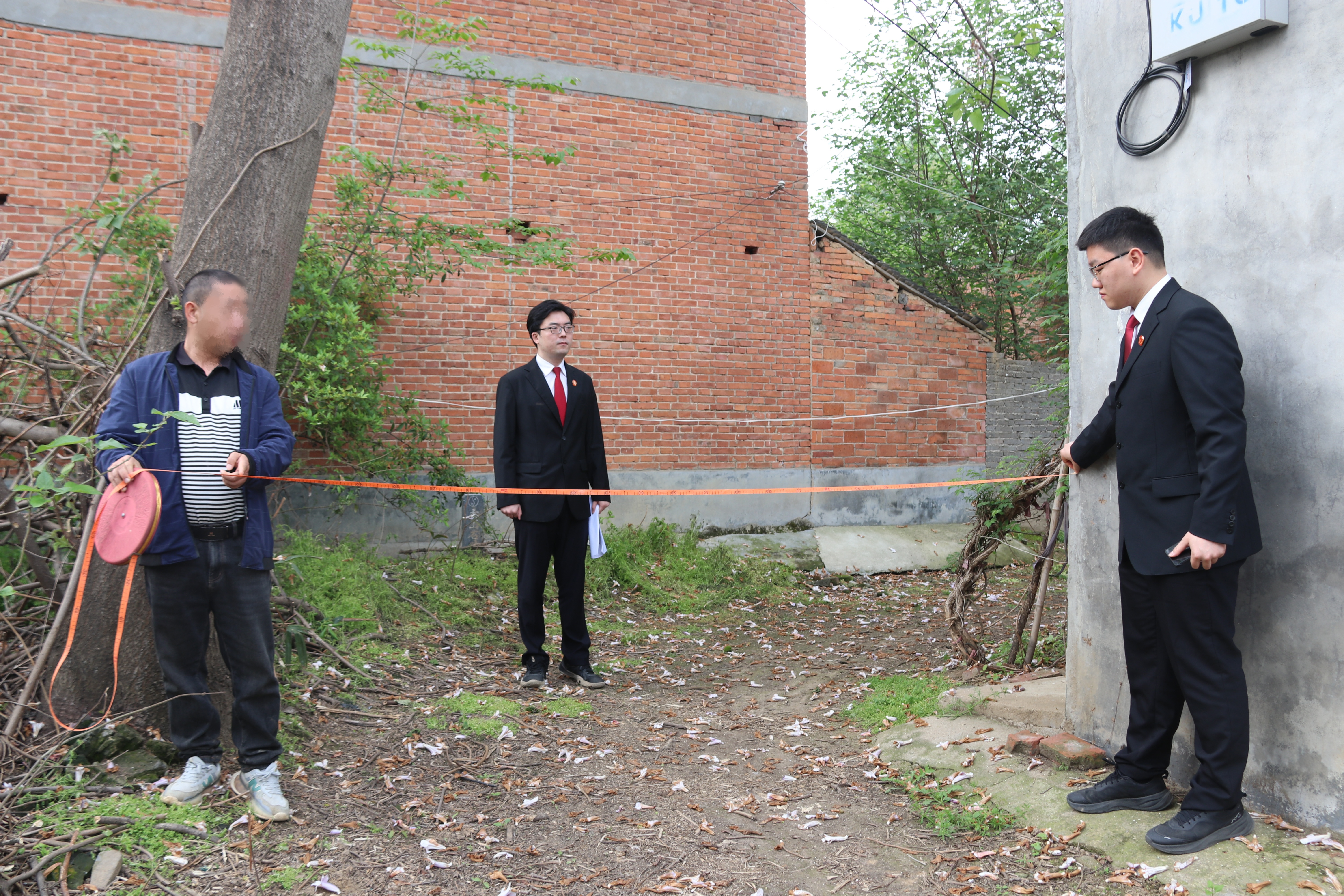 执行干警当即行动,严格按照判决书确定的清除范围,用尺子精准测量距离、用树枝和砖块标记定位,全程邀请村干部、周边村民到场见证,确保清理过程公开透明。在双方当事人确认无误后,执行干警与张某一同清理道路上堆放杂物。