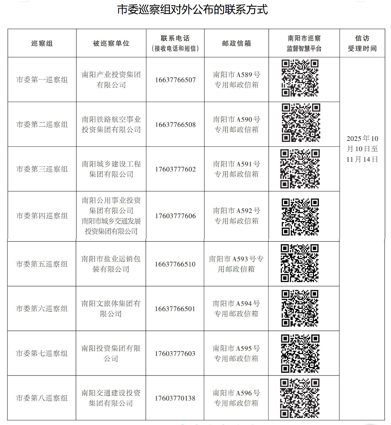 据悉,本次巡察时间40天左右,其间设立专门值班电话、接收短信手机、邮政信箱等信访举报方式,主要受理反映被巡察党组织领导班子及其成员、其他市管干部、下一级单位主要负责人和重要岗位人员问题的来信来电来访,重点是关于违反政治纪律、组织纪律、廉洁纪律、群众纪律、工作纪律和生活纪律等方面的举报和反映。在此之外,专门开通“南阳市巡察监督智慧平台”,广大干部群众可以直接扫描二维码反映情况。