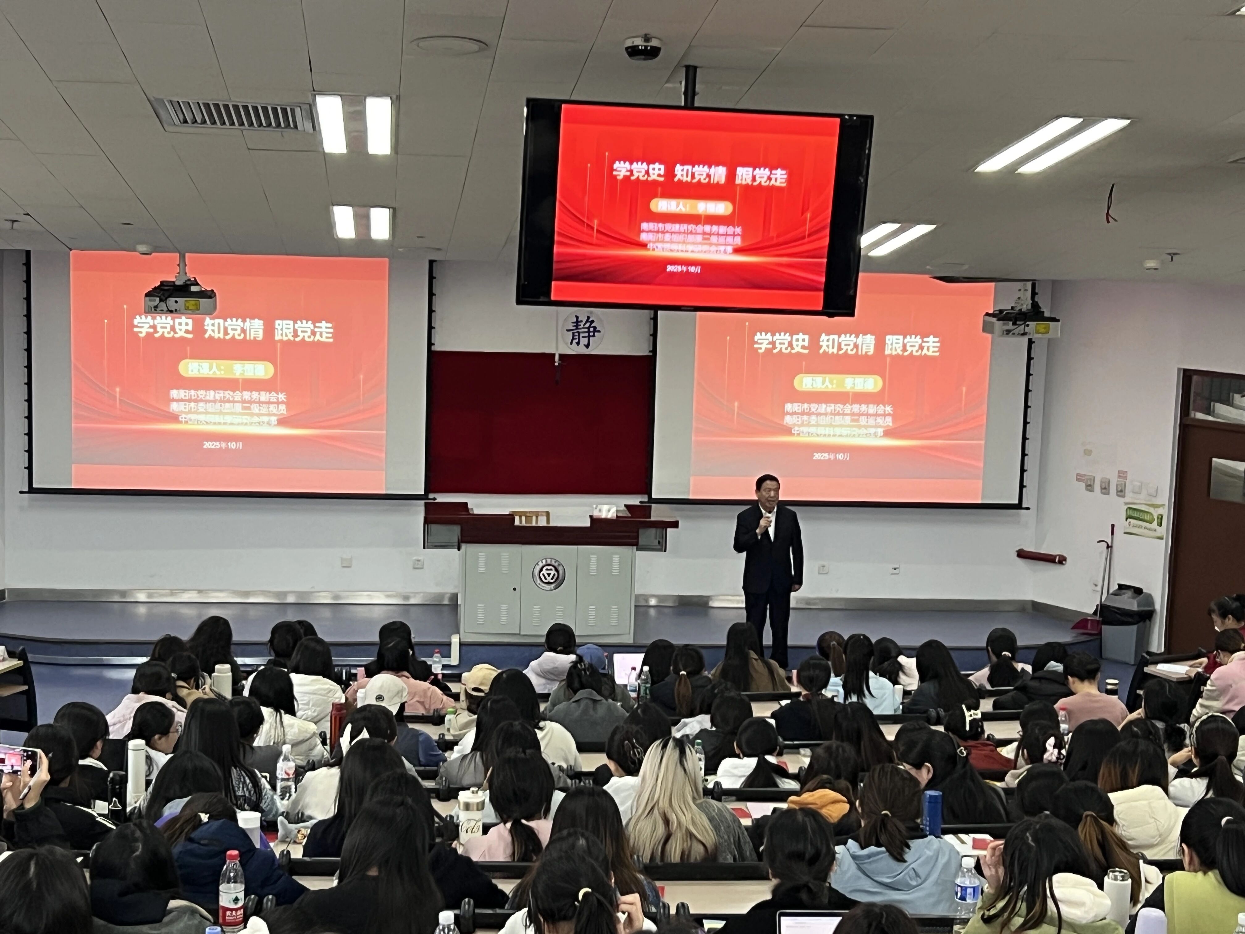 在全国上下深入学习贯彻党的二十届四中全会精神之际,10月28日至29日,南阳市党建研究会常务副会长、南阳市委组织部原二级巡视员、中国领导科学研究会理事李恒德,应邀走进中华女子学院党校,以“学党史・知党情・跟党走”为主题,先后为260余名入党积极分子、100余名党员发展对象进行授课,中华女子学院党委常委、组织部部长张霞主持授课。这堂课,将百年党史的波澜壮阔与青年成长的使命担当紧密结合,用鲜活的史实、深刻的思考、真挚的情感,让在场每一位青年都感受到了思想的深度、历史的厚度与信仰的力量。