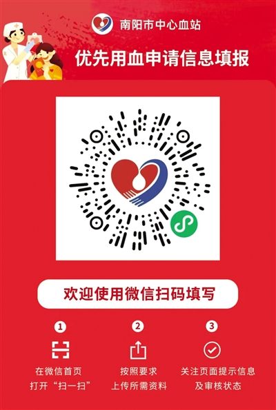 微信扫描下方二维码,进入南阳市中心血站“优先用血”小程序,上传《南阳市临床输血申请单》和《南阳市无偿献血及其亲属优先用血登记表》及相关证明材料。