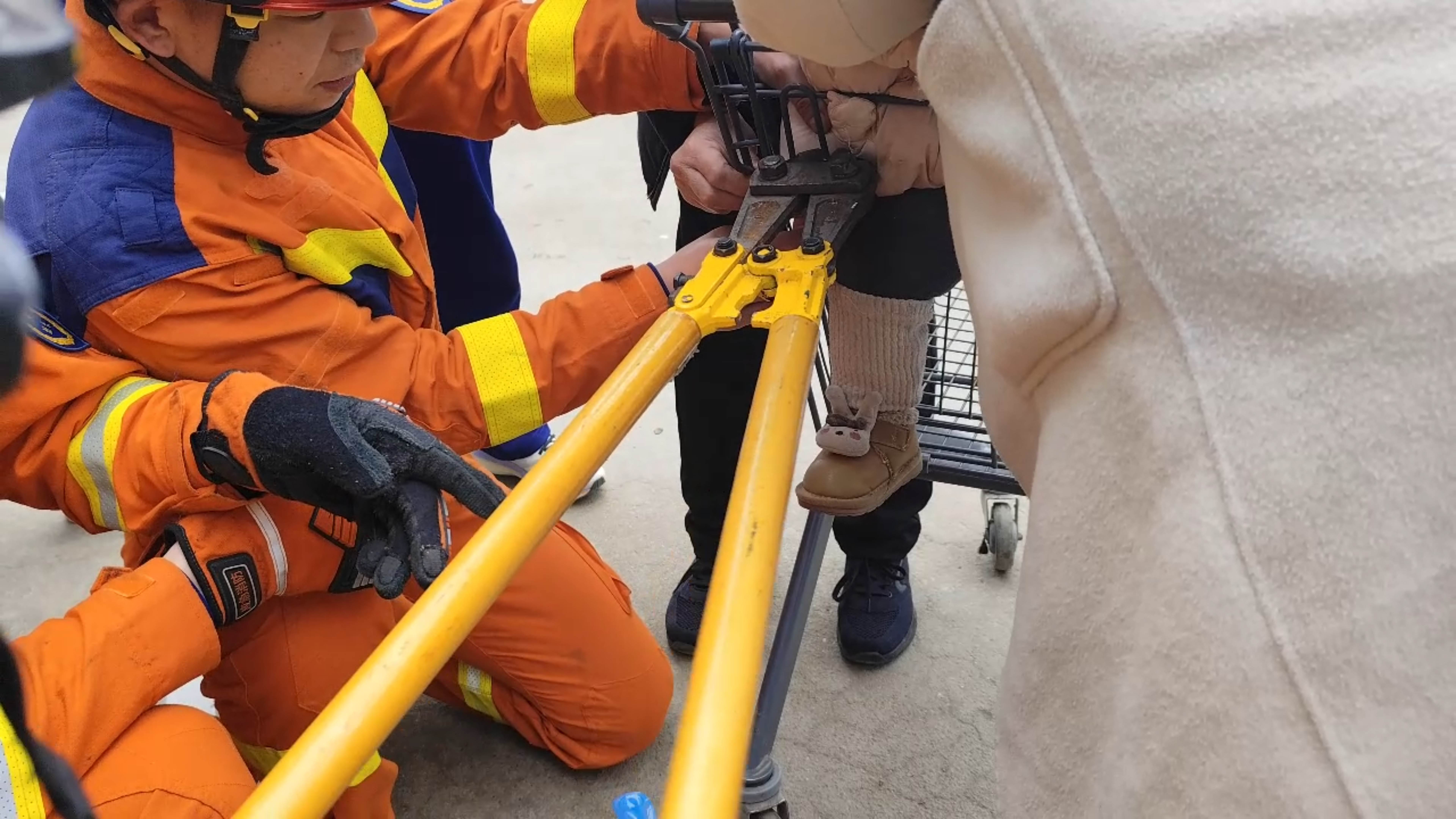 消防救援人员一边安抚小孩情绪,一边迅速了解情况,随后立即展开救援行动。经过仔细观察,救援人员当机立断,利用剪断钳等工具对购物车钢条进行拆扩。