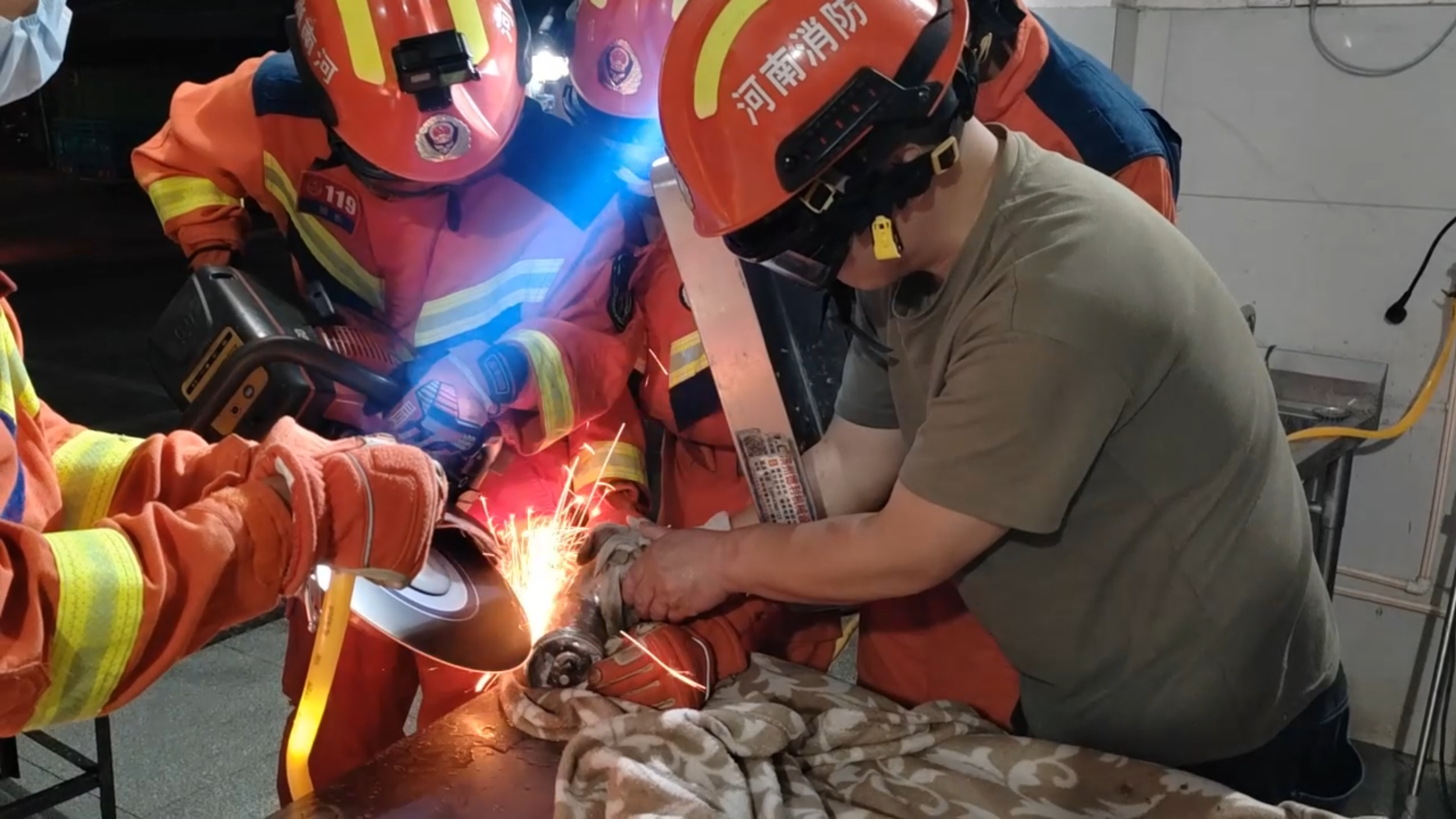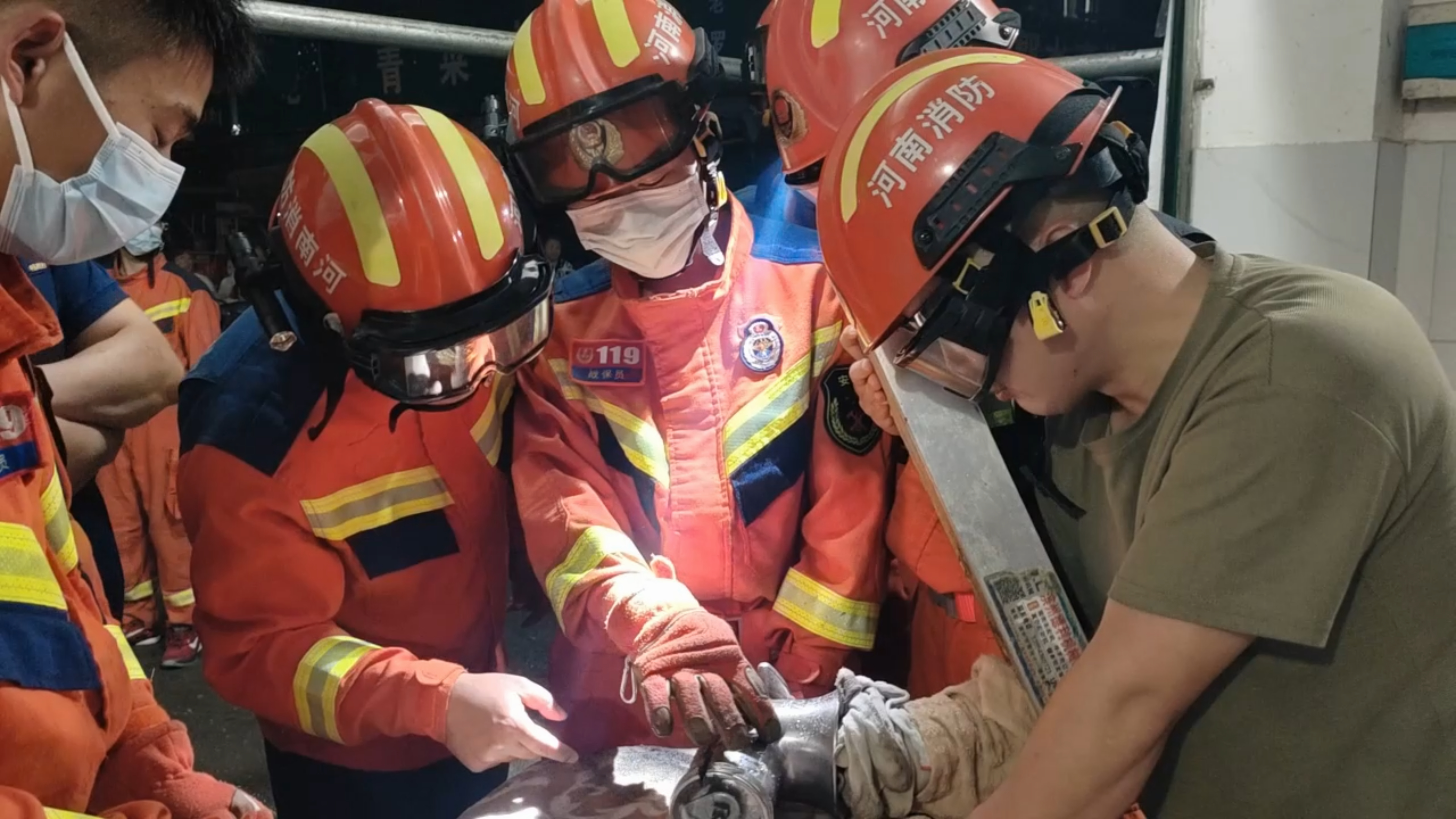 接到报警后,西峡消防迅速出动赶赴现场。消防员全面勘查设备结构,设置警戒区域,结合不锈钢机身坚固、内部空间狭小的特点,制定稳妥救援方案。