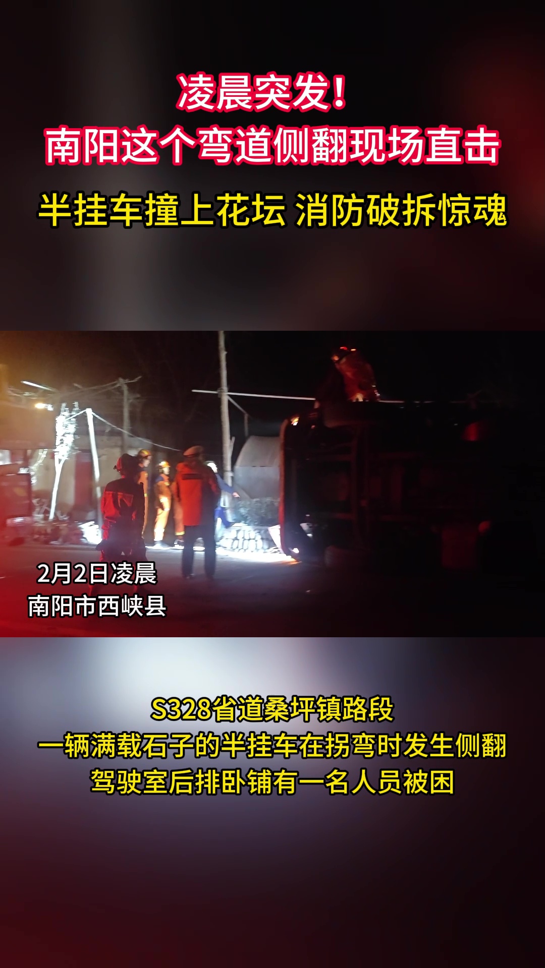凌晨突发!南阳这个弯道侧翻现场直击:半挂车撞上花坛 消防破拆惊魂