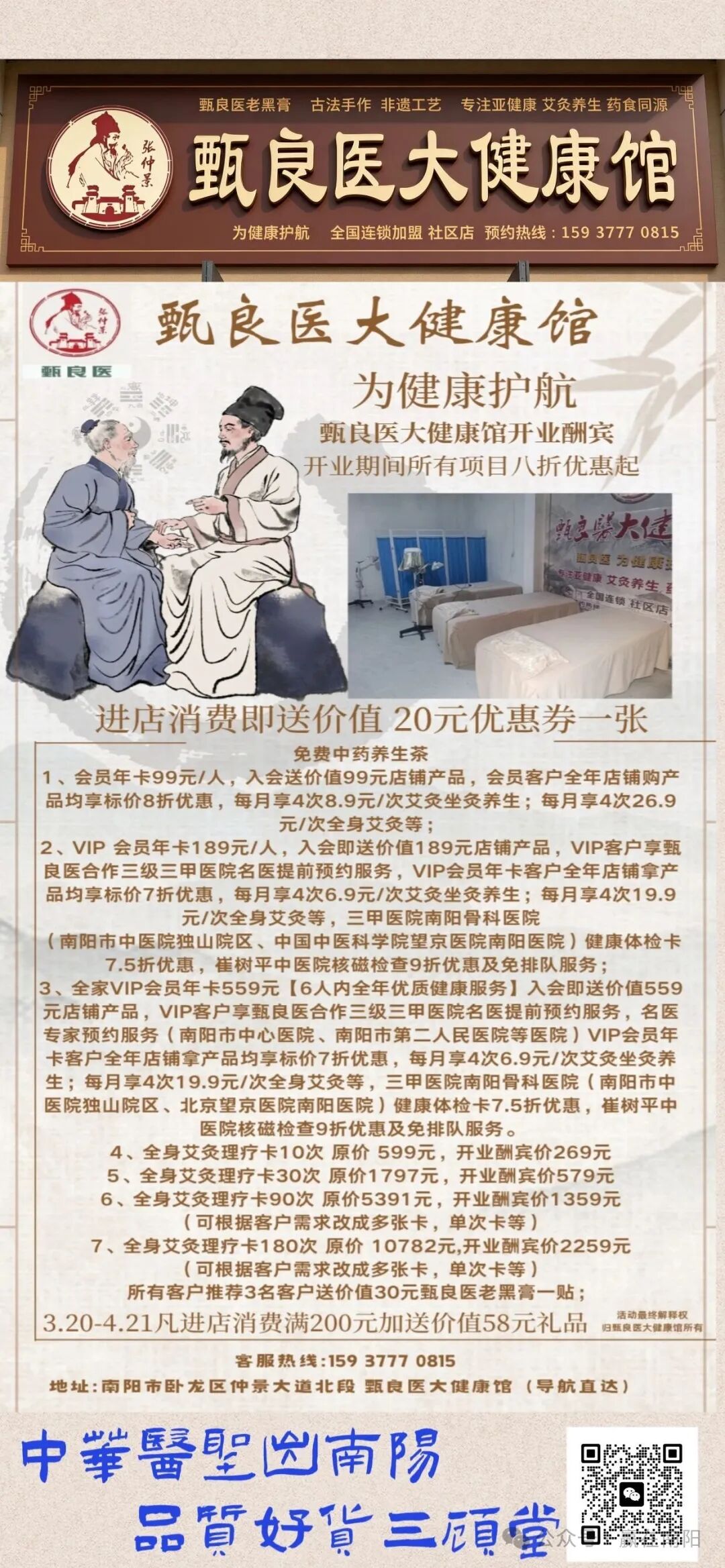 甄良医大健康馆依托河南三顾堂实业有限公司、七十二行(南阳)供应链管理有限公司的深厚底蕴及优质资源,传承古法手作与非遗工艺,专注亚健康调理、艾灸养生与药食同源领域,致力于打造“社区型健康服务中心”。此次开业,甄良医大健康馆特别推出多重优惠,让市民在家门口以更实惠的价格享受优质健康养生服务。