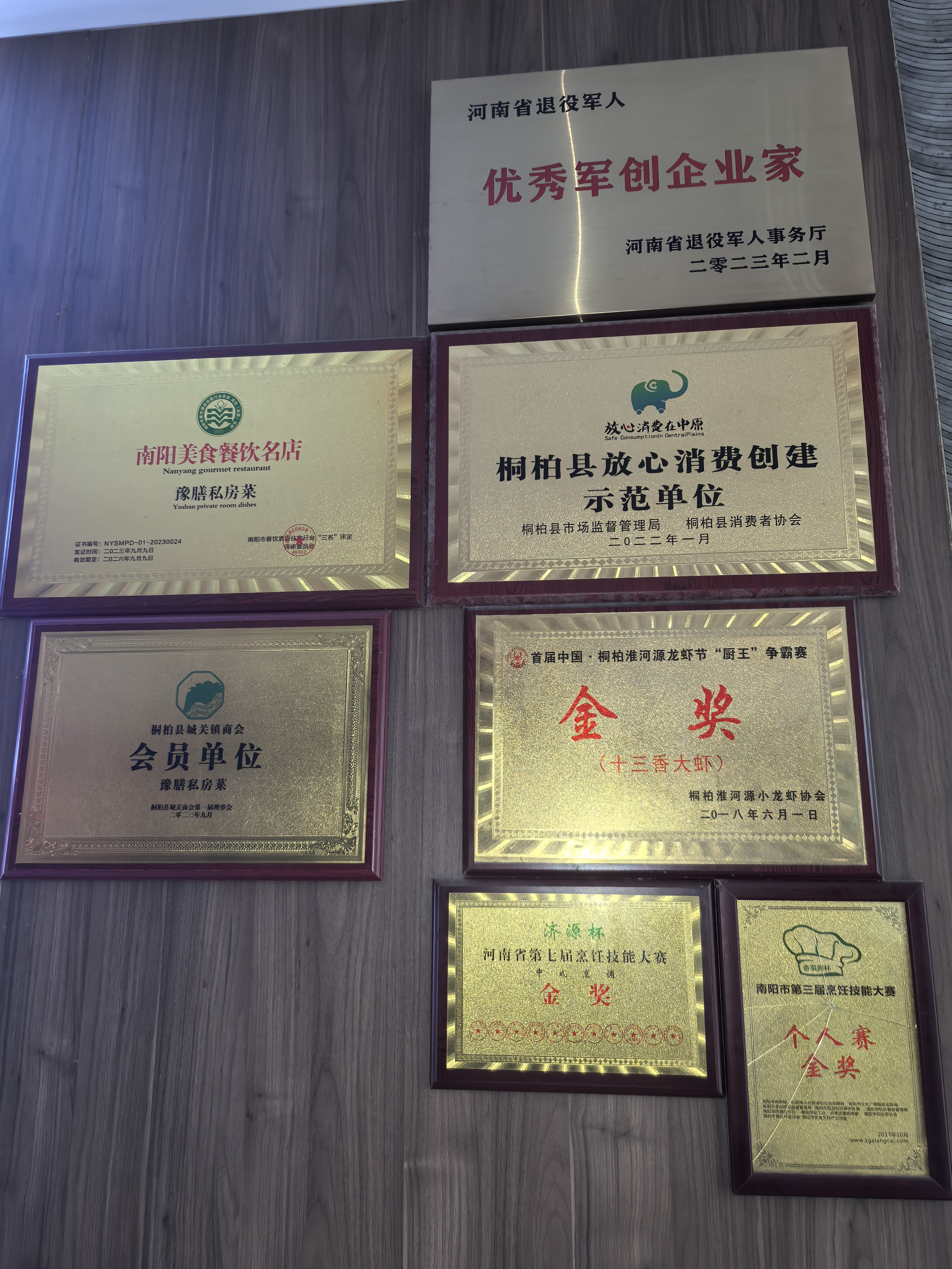过硬的菜品、诚信的经营、暖心的服务,也为他和店铺换来了一项项实打实的官方认可与行业殊荣:河南省第七届烹饪技能大赛“济源杯”金奖、南阳市第三届烹饪技能大赛个人赛金奖、首届中国·桐柏淮河源龙虾节“厨王”争霸赛金奖(十三香大虾品类),南阳市美食餐饮名店,桐柏县放心消费创建示范单位,等等。