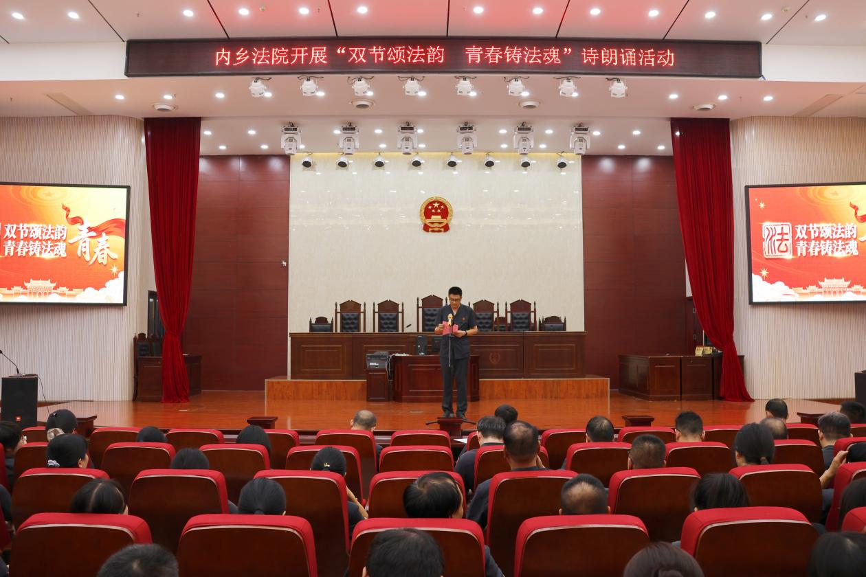 金秋送爽迎双节,法韵铿锵映初心。9月29日晚7时,河南省内乡县人民法院大审判庭内灯光璀璨、氛围热烈,“双节颂法韵,青春铸法魂”主题诗朗诵活动在此温情启幕。全体干警齐聚一堂,共同聆听16名新入职干警以诗为媒、以声传情,在中秋与国庆“双节”来临之际,奏响法治与青春的交响,抒发对祖国的赤诚热爱与对司法事业的坚定追求。