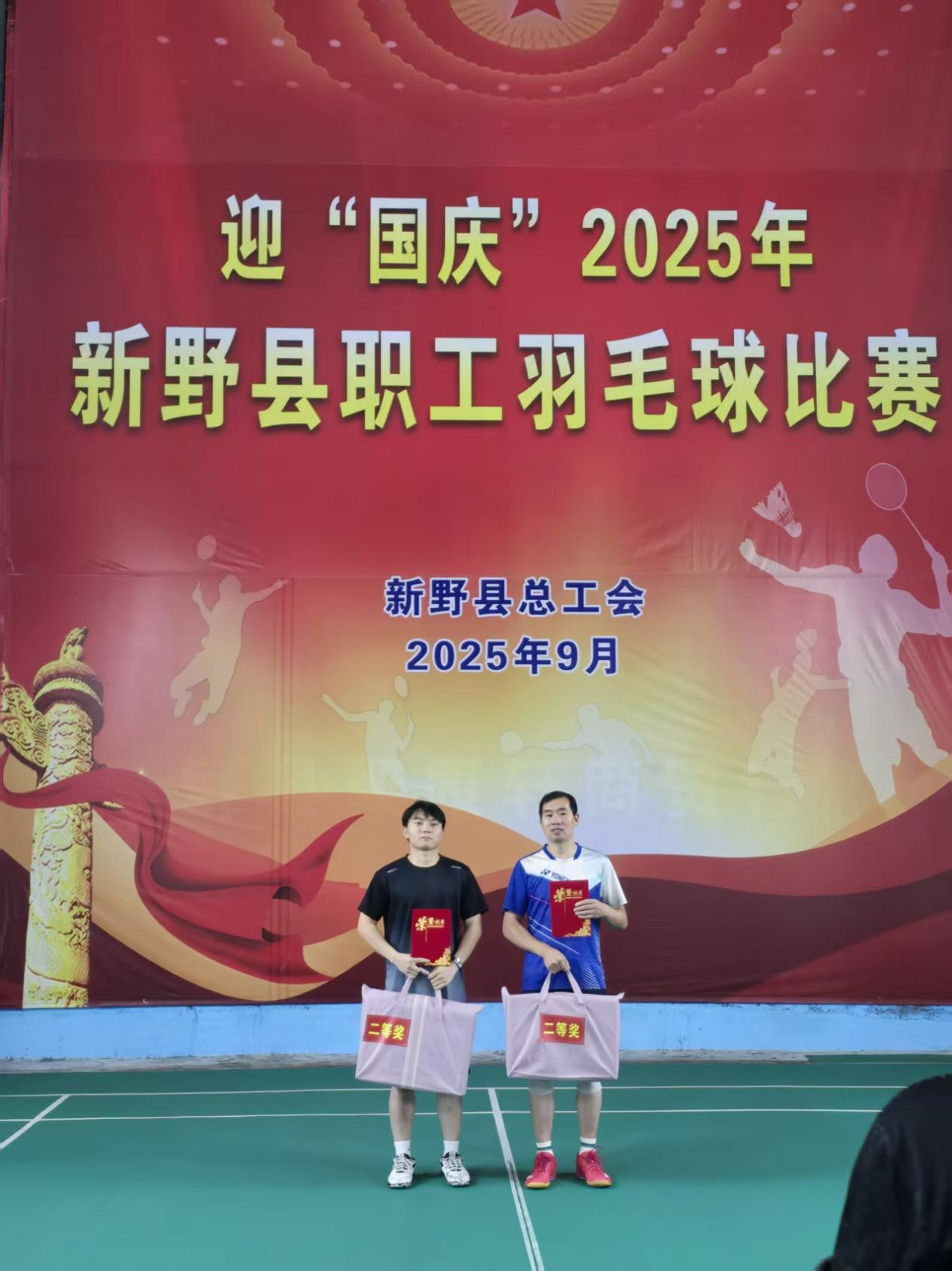 2025年9月29日,由新野县总工会主办的迎“国庆”2025年新野县职工羽毛球比赛落下帷幕。新野县人民法院干警何文扬积极报名踊跃参加,最终喜获羽毛球比赛男子单打第二名、男子双打第二名的好成绩。