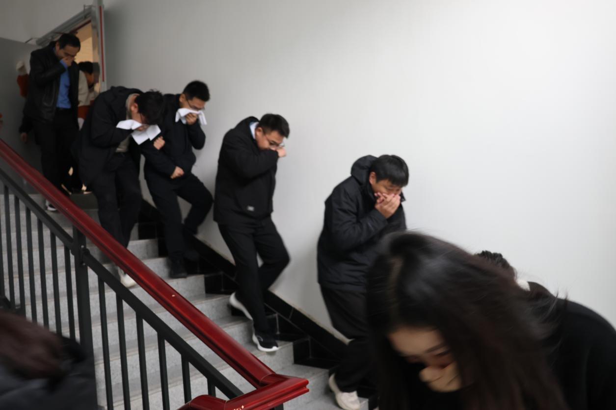 随后,逃生演练正式启动。模拟场景设定为法院办公楼某楼层突发“火情”,浓烟迅速蔓延。随着警报声响起,参与演练人员在引导员的引领下,迅速用湿毛巾捂住口鼻,保持低姿弯腰,沿着预定疏散路线快速、有序向楼外安全区域撤离。随后,县消防救援大队工作人员对演练过程进行复盘,指出疏散过程中存在的细节问题,并再次强调紧急情况下的逃生注意事项,确保演练实效。