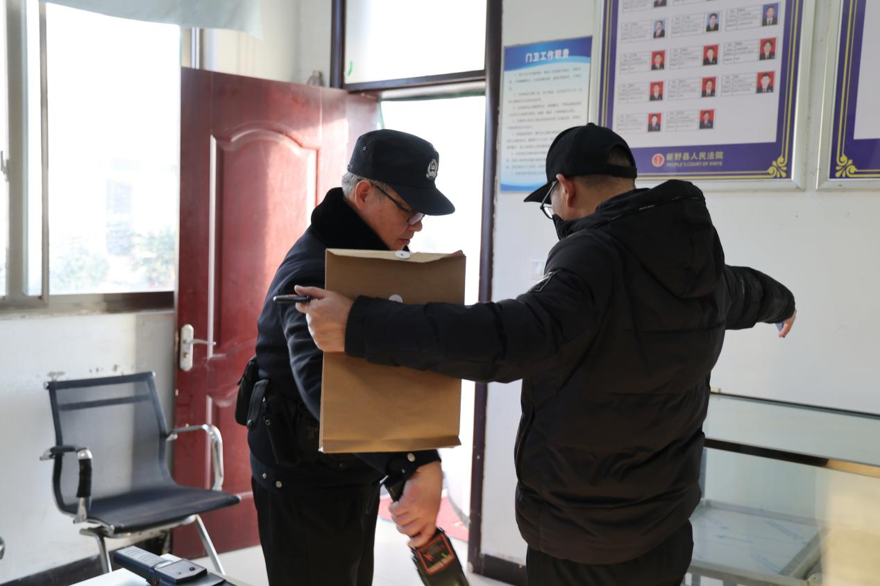 司法警察早早到达工作岗位,对来院当事人以及携带物品进行安全检查,防止违禁物品进入诉讼、审判场所,确保法院审判执行工作安全有序。