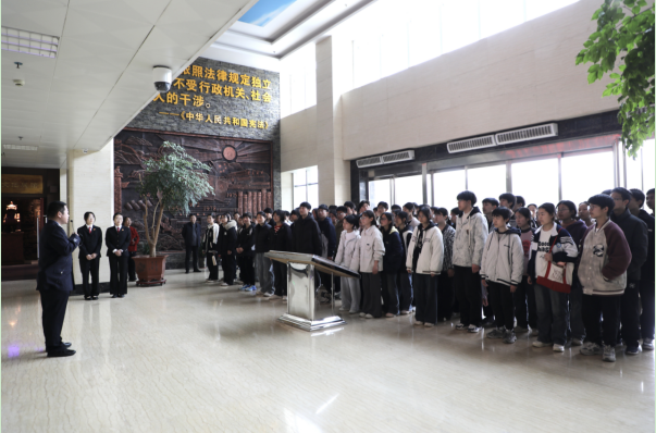 为进一步加强青少年法治教育,3月26日上午,河南省新野县人民法院举办2026年第六次“公众开放日”活动,溧河铺法庭邀请溧河铺镇初级中学的八十余名初三学生走进法院,开启一场“沉浸式”法治文化探索之旅。