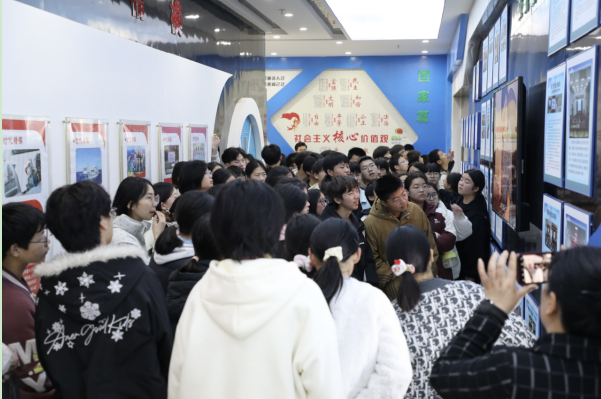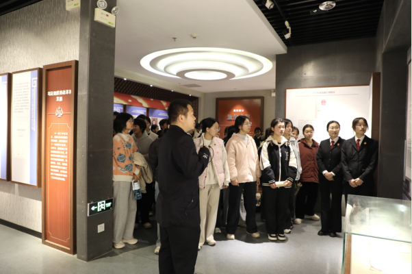 在讲解员的引导下,同学们首先步入法治文化展馆。丰富的图文展板、珍贵的法治史料与现代化的多媒体展示相互交融,生动再现了我国法治文明的演进历程与法治建设的辉煌成就。