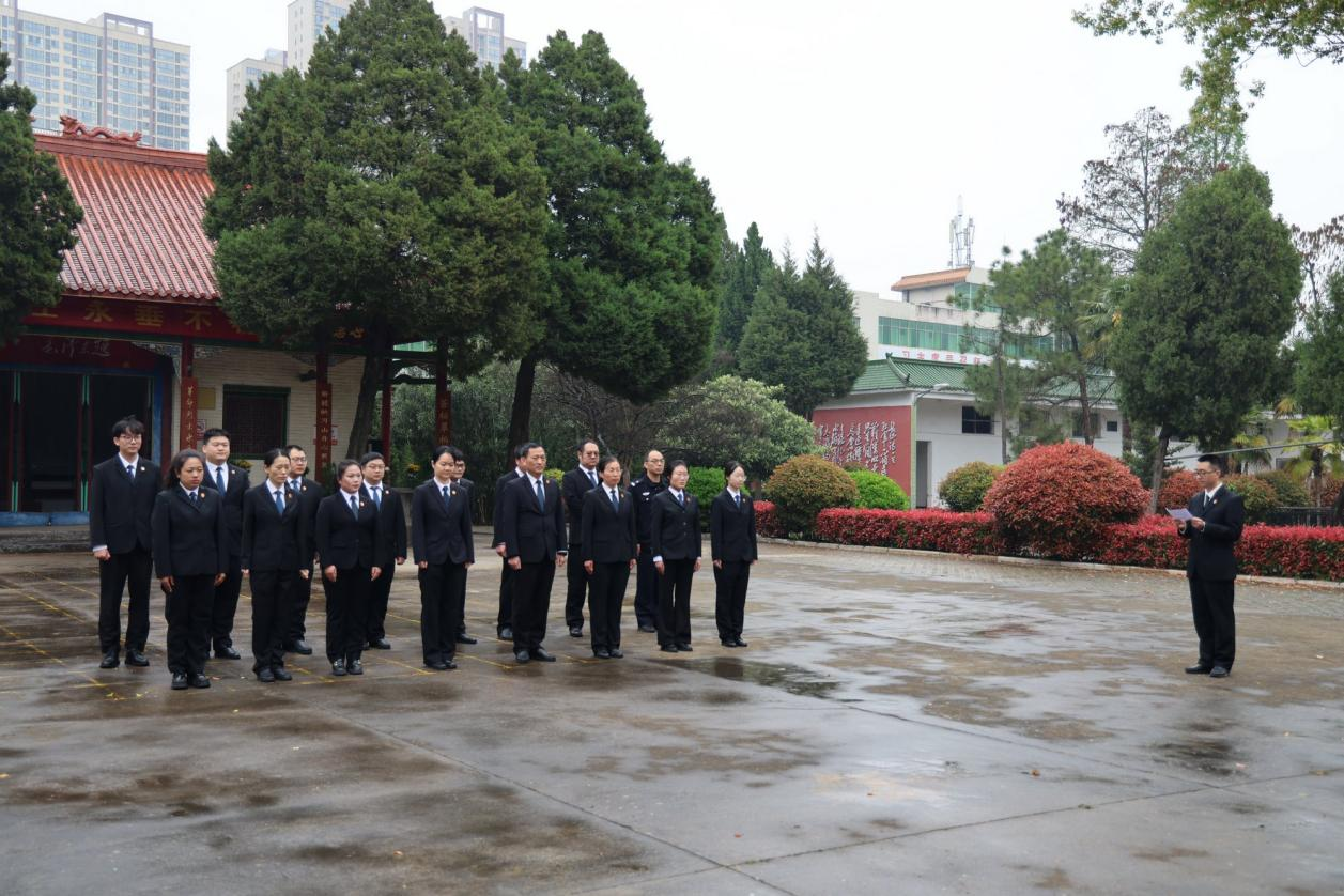 下午三时,天空下起了淅淅沥沥的小雨,烈士陵园内翠柏青松掩映,庄严肃穆。干警们身着制服、整齐列队,面向革命烈士纪念碑肃立。院党组成员、政治部主任王瑞朋回顾革命先烈的光辉业绩,号召全体干警铭记历史、珍惜当下,将崇敬之情转化为司法为民、公正司法的实际行动,让红色信仰在司法血脉中绵延,让法治初心于历史传承中闪光。