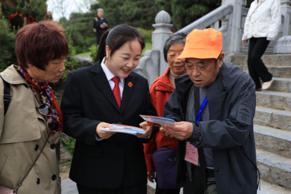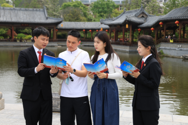 在诸葛草庐前,干警们化身“普法讲解员”,通过发放宣传手册、现场解疑等方式,与游览的群众围站在一起,为他们讲解《中华人民共和国反有组织犯罪法》《中华人民共和国国家安全法》等法律法规。在古朴照壁前,基层法院干警们手持漫画图解的《中华人民共和国反间谍法》,向过往群众揭示隐藏在“糖衣炮弹”后面的危险,将维护国家安全的重要性融入一幅幅通俗易懂的画面中。