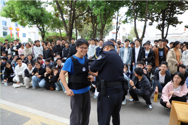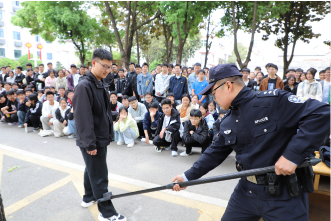 “同学们,现在我们来到的地方是法院安检通道,安检作为法院对外的第一道窗口,担负着安全检查、接待引导的重要任务。”法警队干警向学生们介绍了安检流程,师生们共同参观和体验了安检设施。干警又向同学们展示了各种警用装备和应急处突设备,电击枪、警用甩棍、防暴钢叉、催泪瓦斯等装备看的同学们眼花缭乱,现场演示也让同学们体验感满满。