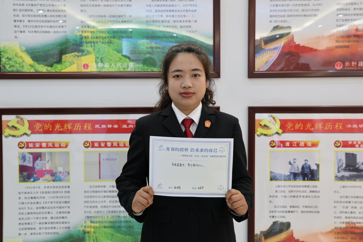 青春逢盛世,奋斗践初心。作为法院青年政工干警,我们虽不持法槌、不著法袍,却以“润物无声”的坚守,筑牢队伍的政治忠诚。政工工作事无巨细,我将始终心怀法治信仰,初心如磐、步履不停,立足政工岗位,坚守公平正义,以奋斗诠释担当,用实干书写韶华,不负组织信任、不负岗位职责、不负青春韶华,让青春在法徽照耀下砥砺奋进、绽放光彩,在新时代法院政工事业中书写无悔青春答卷。