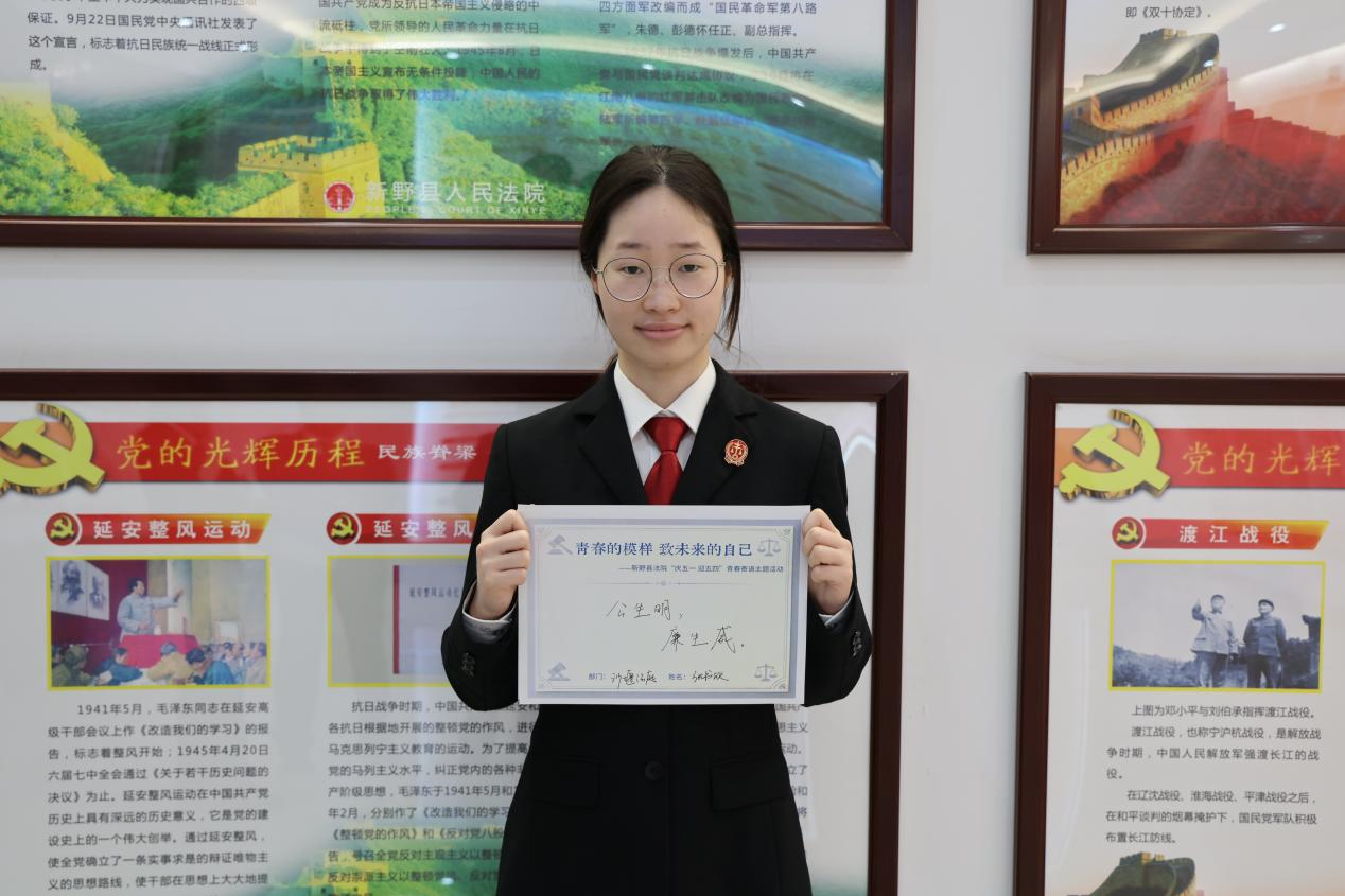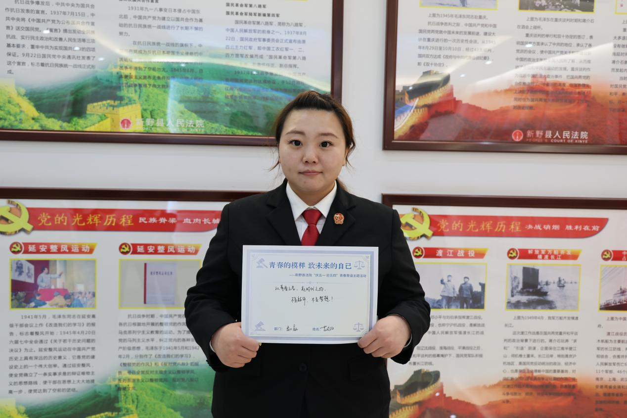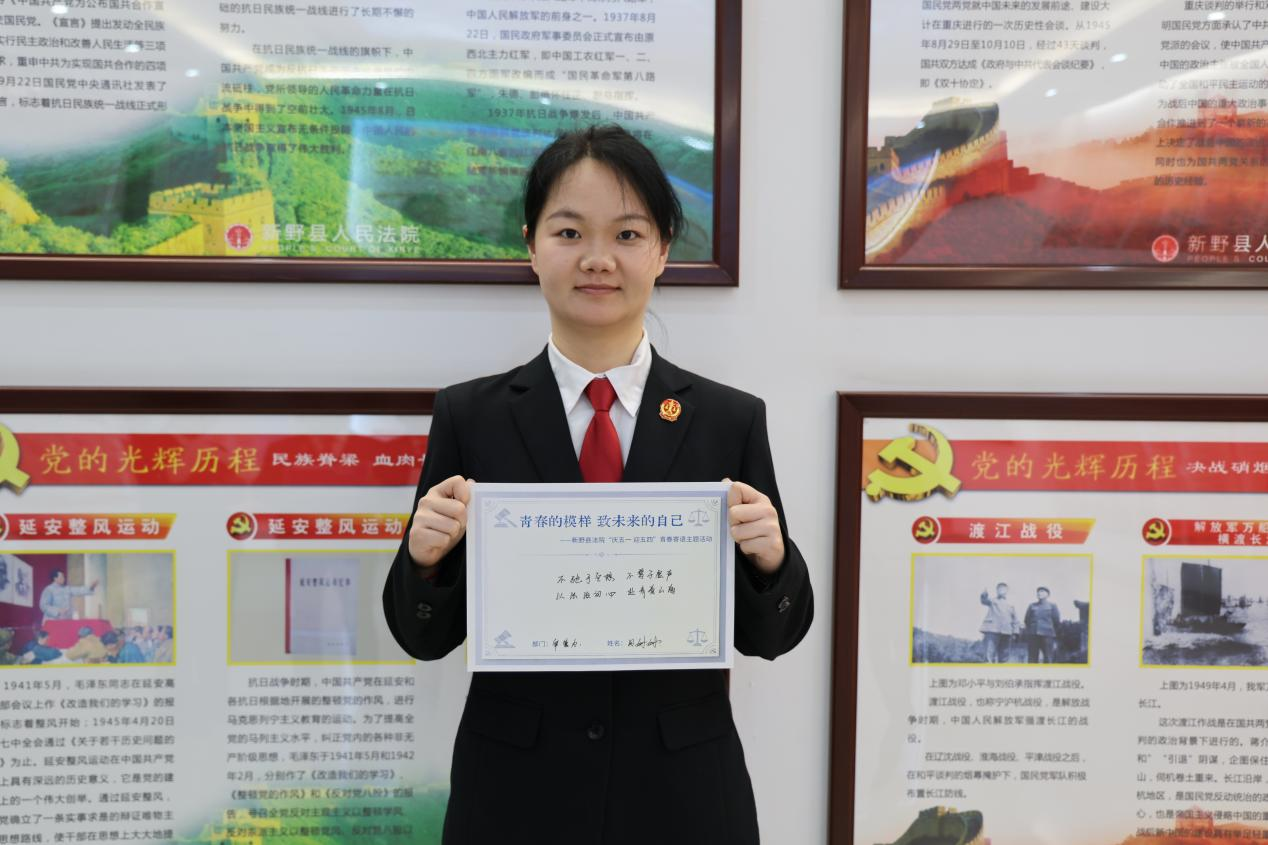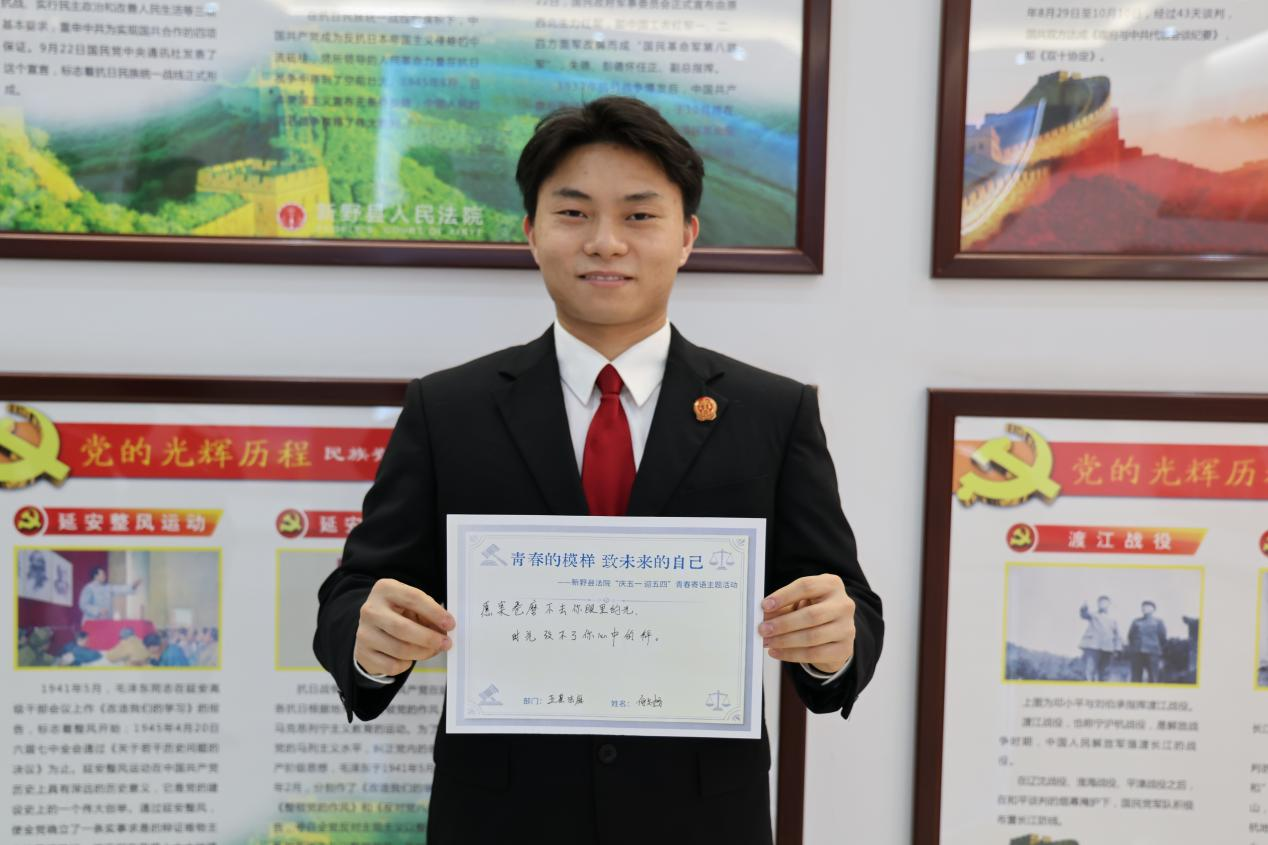 春末夏初,万物蓬勃,法徽闪耀,青春昂扬。为弘扬劳模精神、传承五四薪火,凝聚青年干警奋进力量,4月27日,在“五一”国际劳动节、“五四”青年节来临之际,河南省新野县人民法院开展“青春的模样 致未来的自己”青春寄语主题活动,激励全体青年干警以实干担当践行司法为民初心,以青春之力护航法治新征程。