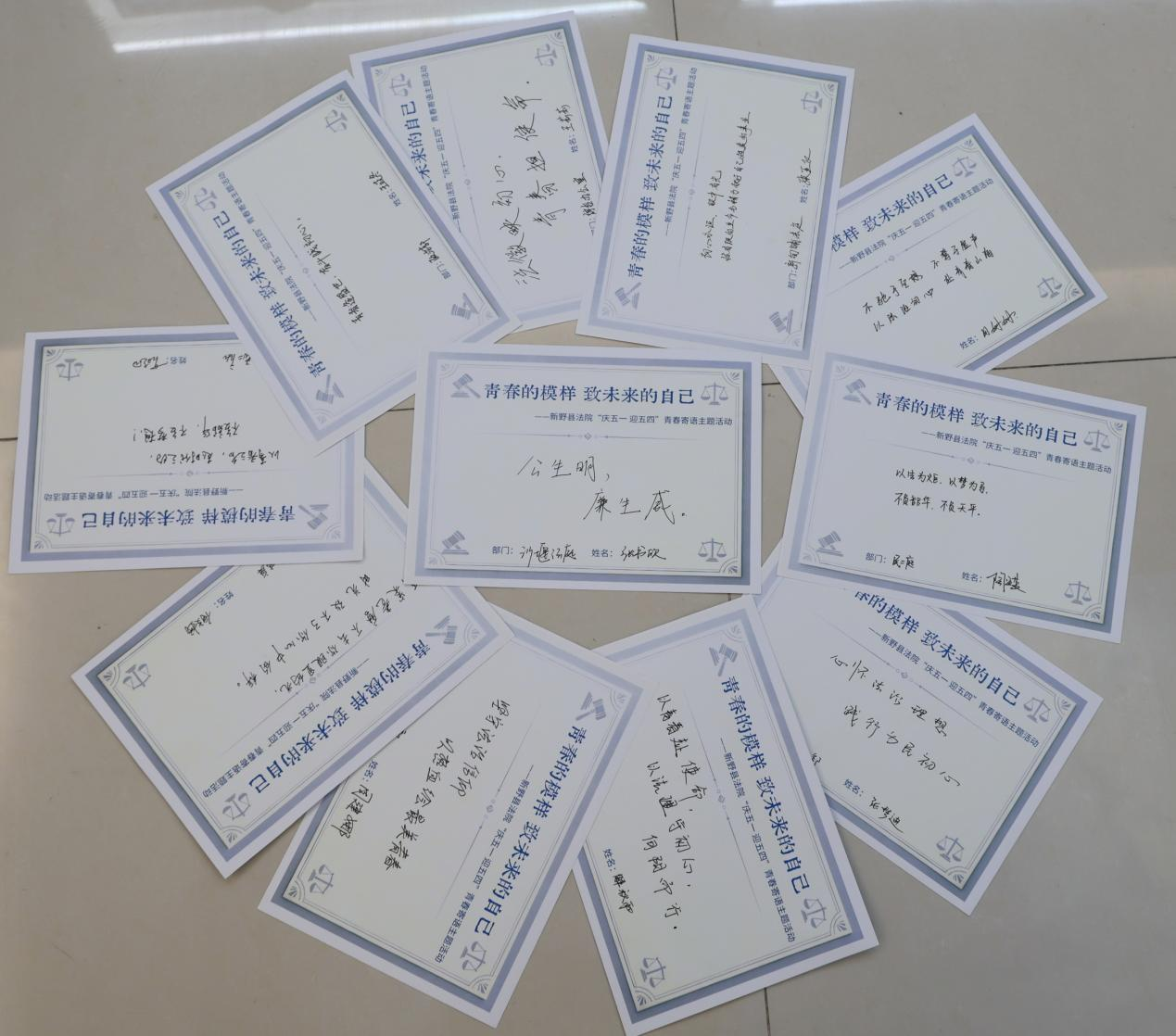 活动现场,青年干警们立足岗位实际,在寄语卡片上认真书写青春誓言并互相交流心得感悟,或抒发对法治事业的赤诚初心,或立下对未来工作的奋斗期许,或寄语成长路上的自己,一字一句饱含对司法事业的热爱与坚守,定格下法院青年昂扬向上的青春模样。